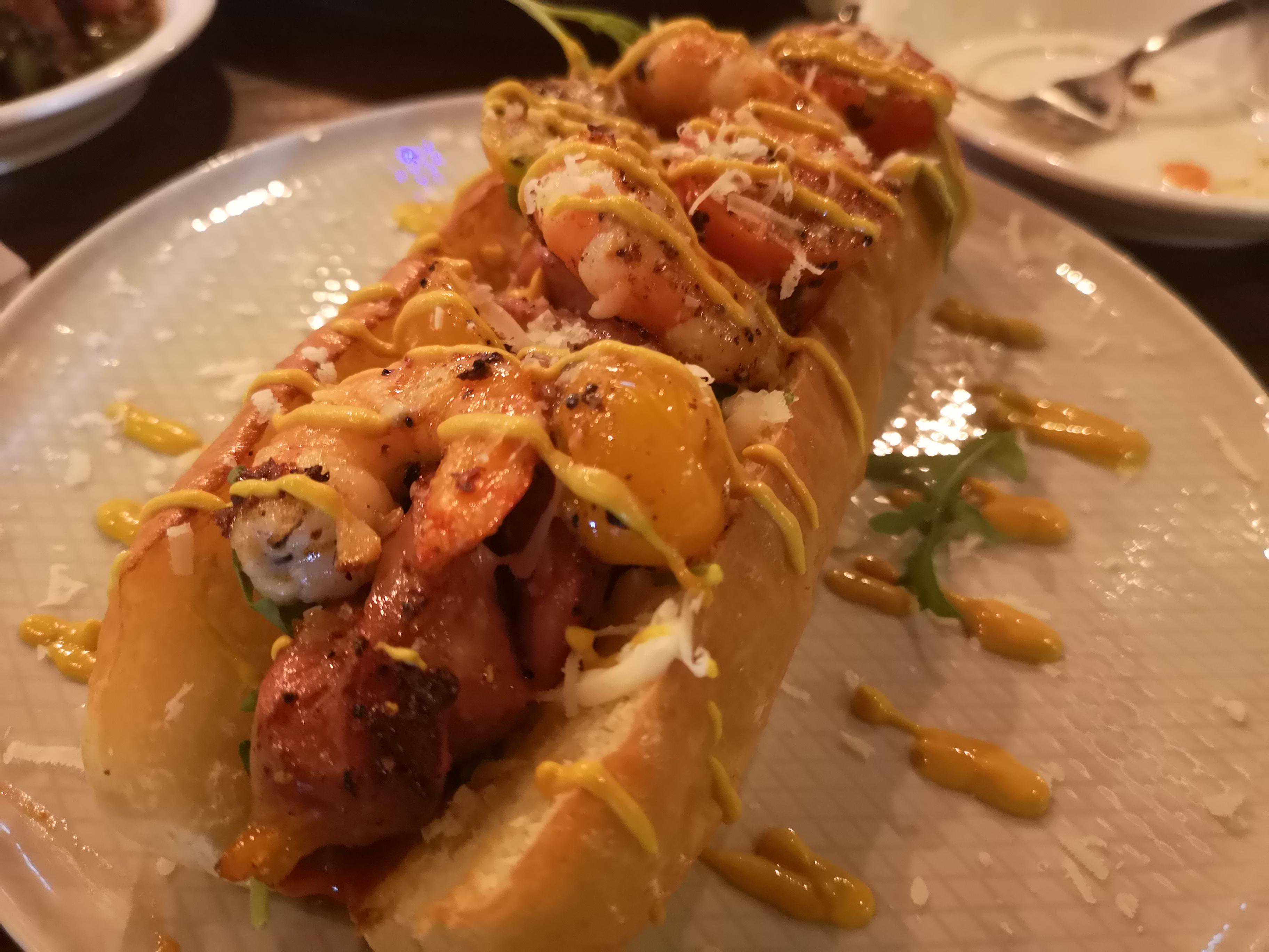 热狗,里面有香肠、虾、番茄、罗勒酱、黄芥末酱,吃着鲜香,口感饱满,尤其热狗面包口感很棒。