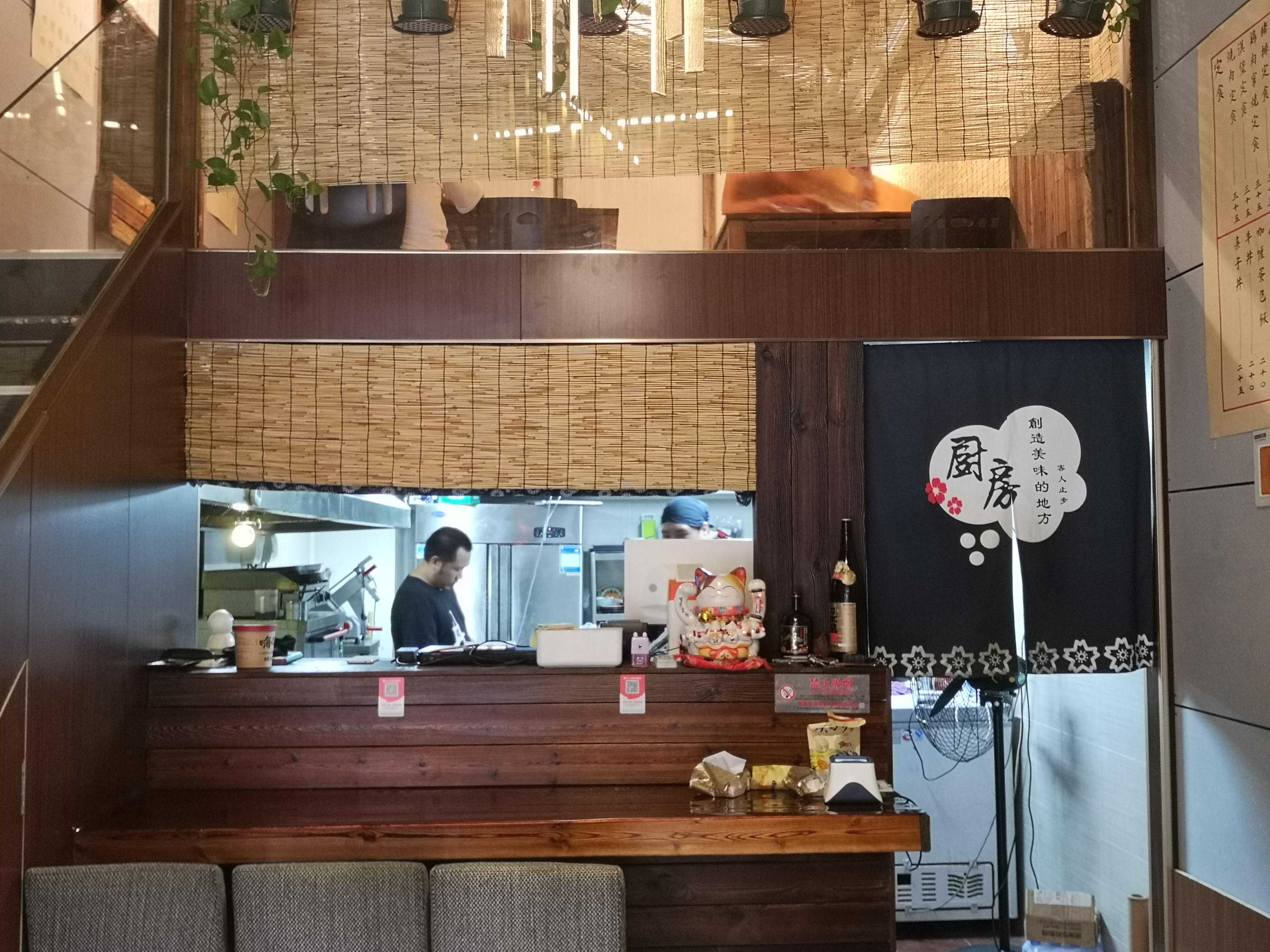 这家小店整体是LOFT的结构,走进店里映入眼帘的是一个小吧台有几个座位,里面厨师在忙碌的制作菜品,旁边是楼梯,走上二楼是榻榻米,需要拖鞋。