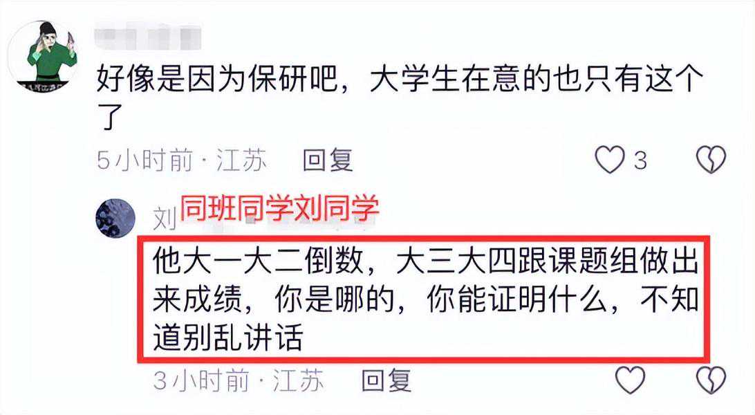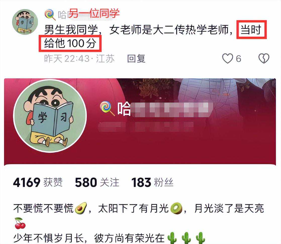 接着又有人爆出,两人之间似乎还暗藏着一些不为人知的秘密。据网友猜测这位男同学有可能是因为研究生名额才和老师在一起,不过,很快,一位疑似男生同班同学表示,这位同学平常的成绩非常的差,可以说是吊车尾,等到了大三大四跟做课题这才补上成绩。