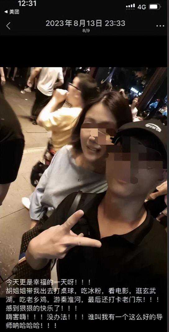 根据网友们的深挖,我们可以从男同学的朋友圈得知,他和女老师在去年8月份就已经开始频繁的联系了,在他的文案中,他亲切的称自己的老师为胡姐姐,并且两人这天的生活可谓十分的丰富,吃喝玩乐是样样不落,看起来非常的幸福。