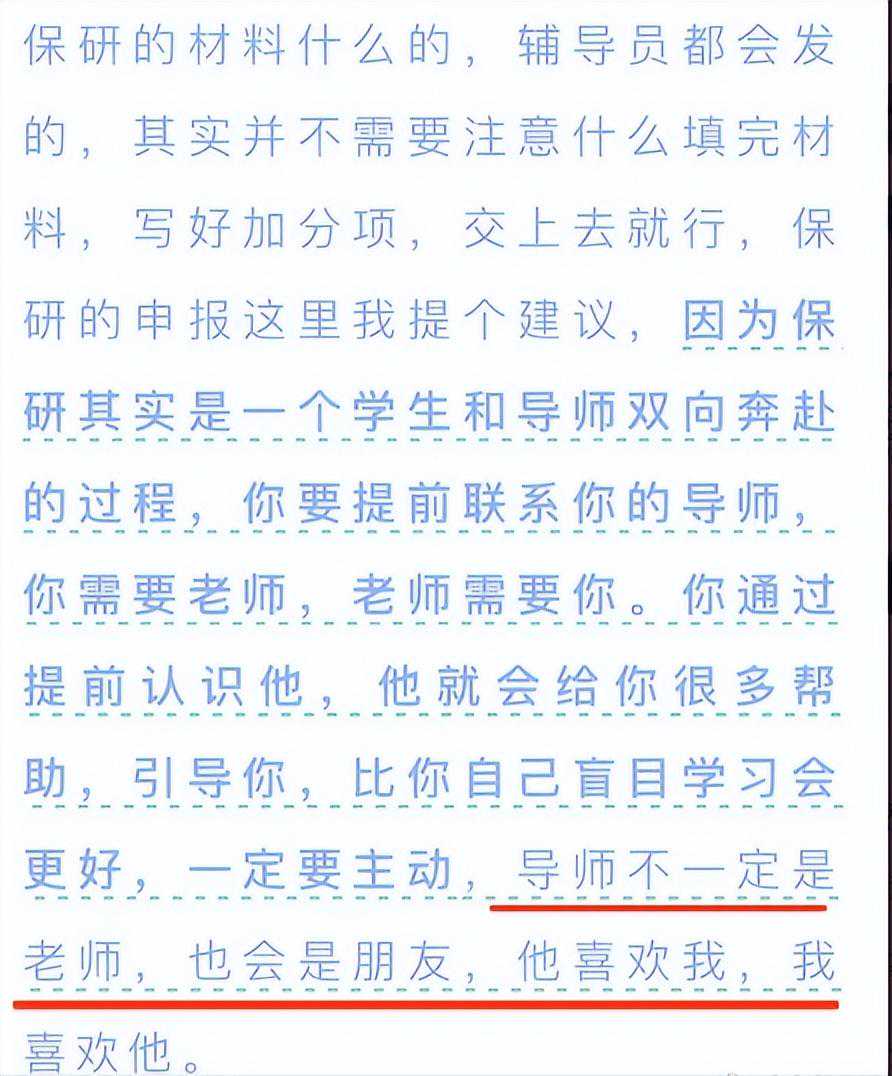 这份资料和之前知情者的爆料有着很大的出入,孰真孰假我们则不得而知。不过,更有细心的网友发现,男同学吃呢挂在自己的保研资料中写道:“导师不一定是老师,也会是朋友,他喜欢我,我喜欢他”。