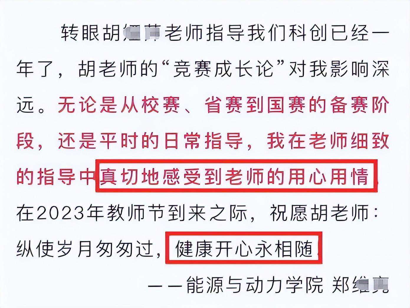 而那名男同学正是她指导下的一名学子,据他所说胡教授对自己很是照顾。网友们纷纷深入挖掘郑同学的背景资料,发现他的确是一位出类拔萃的学子。在大学一年级便顺利通过了英语四六级考试,屡次荣获学校颁发的一等奖学金,更在科研竞赛中频频斩获奖项,为母校赢得了无数荣誉。