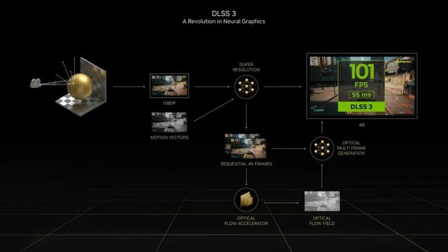 DLSS3包含"三大"技术,即:DLSS3超分辨率+NVIDIAReflex+DLSS帧生成。DLSS3可以在提升帧率的同时进一步降低系统的资源消耗,从而以更小的开销为用户提供到更为真实流畅的视觉体验。
