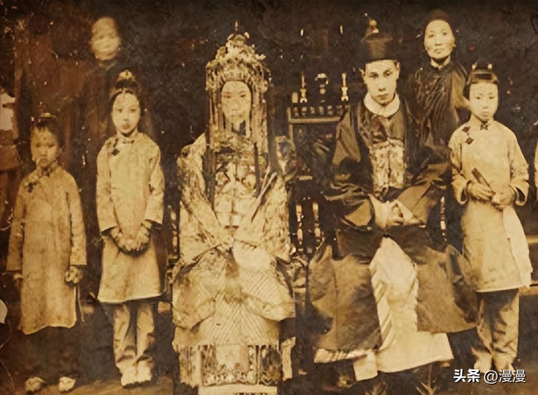 09这是清末时期一个王爷的婚礼照片,从他服装上的团龙补子可以推断出,他应该位在郡王或者以上