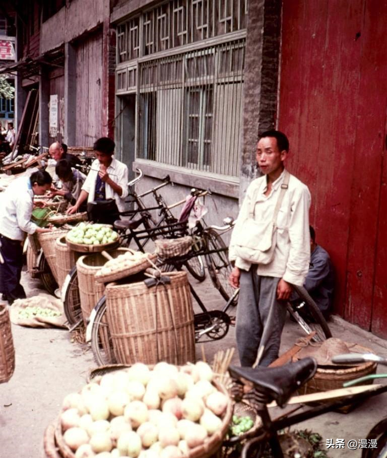 17街边的商贩,自行车上担着两个装满水果蔬菜的筐。
