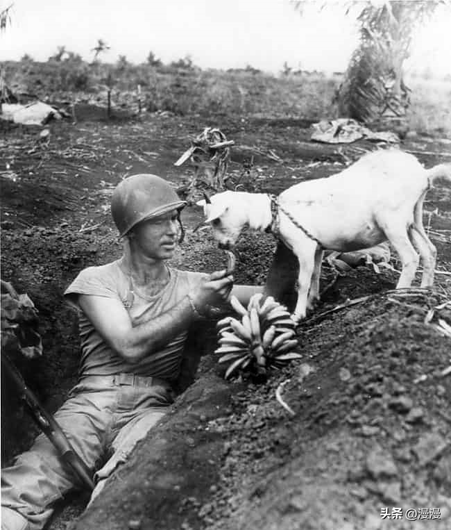 381944年,塞班岛战役中,一名士兵与一只山羊分享香蕉。