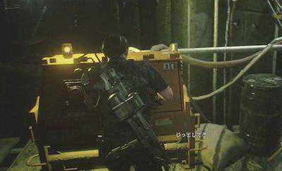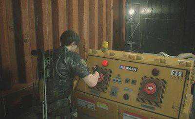 6、从东侧办公室的西侧(地图左边)出来,在走廊墙壁的器械上使用电子部件打开卷帘门。