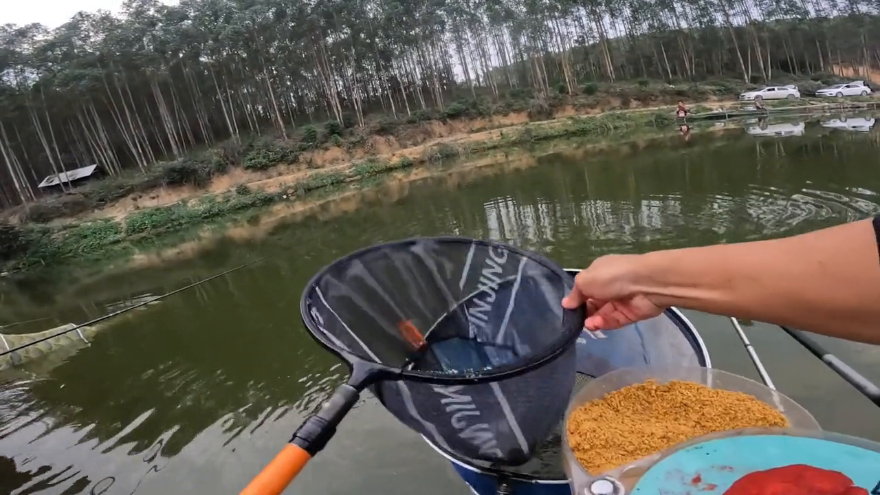 前期还是带点散炮下去做窝,几杆散炮下去之后直接拉饵开钓。今天还是老搭档,3米的小短杆,1.2加0.6的线组。浮漂0.9克,调漂4目,钓个两三目这样子。说话之间旁边的大师一直拉法法,真的那么狂口吗?丢下去就吃的吗?