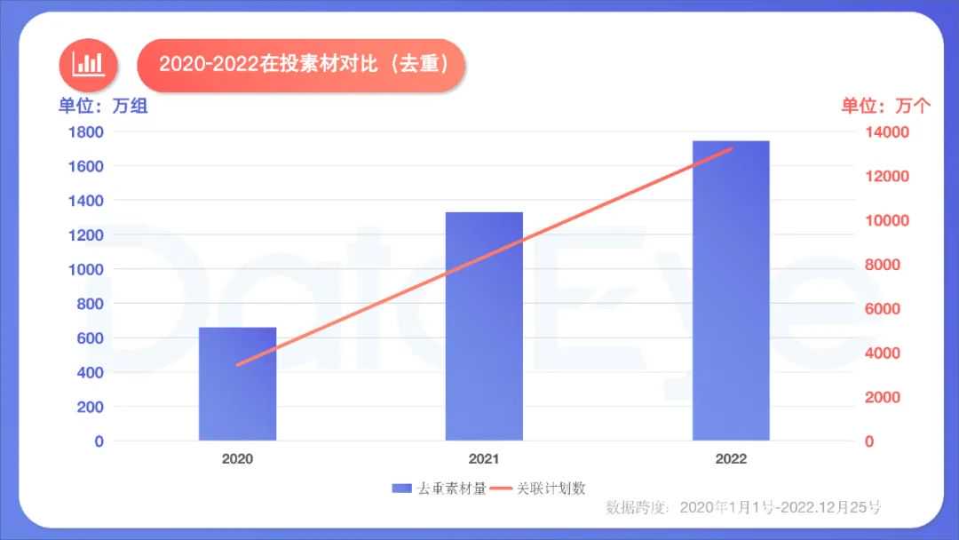 买量素材总量整体提升。截至12月25号,DataEye监测到今年移动游戏(含小游戏)累计投放的买量去重素材量1744万,同比增长31%,关联计划共1.32亿,同增58.8%。今年5月之后总投放量较为平稳。今年行业总体略低迷,素材增长主要因为: