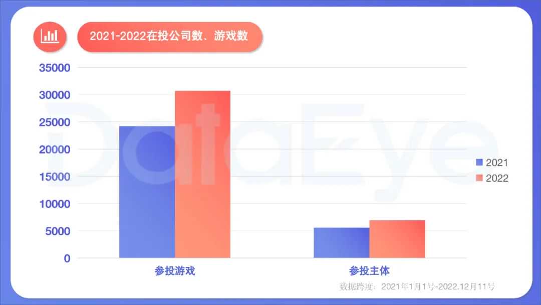 参投游戏数增幅,略高于参投公司数增幅。2022年参投游戏数增长26.7%,高于参投主体数的增长24.2%。今年虽然版号恢复发放,但总量有限,如此程度的游戏数增幅,主要因为: