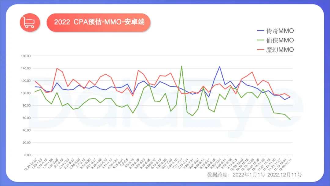 价格总体平稳、维持高位,魔幻iOS端价格波动较大。2022年MMO赛道各题材买量CPA价格总体维持高位,侧面印证竞争激烈——“你不买,总有人愿意买”。价格提升的高峰,往往出现在“淡季”(如过年后、开学后导致用户流失,故而需要补充),或是某些产品入市推升。分客户端来看: