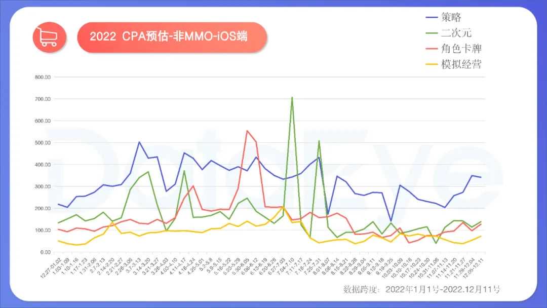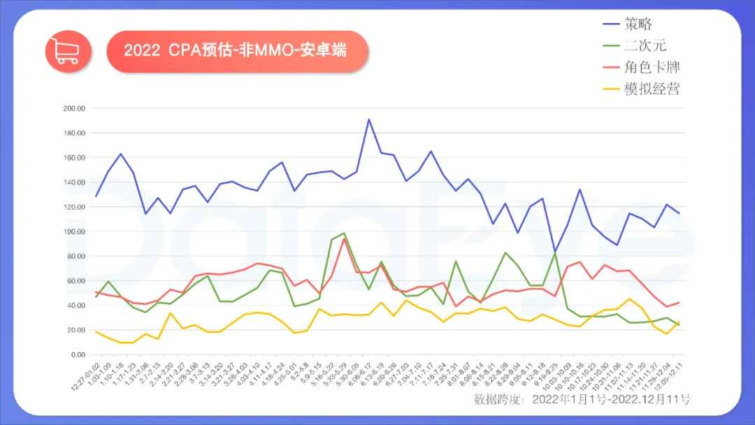 策略赛道结束巨头大战,卡牌、二次元偶有高峰,模拟经营价格较低。策略:一季度,4XSLG赛道投放量居前的产品,囊括了阿里、网易、腾讯、莉莉丝、4399、FunPlus,可谓凑齐了游戏行业的大半壁江山,特别是《文明与征服》《重返帝国》上半年素材投放量凶猛,将CPA价格推至最高500元/A的局面,下半年群雄争霸结束,演变成三七《小小蚁国》与君趣《蚁族崛起:神树之战》的双雄之争,CPA价格虽然有所下滑,但仍然较高。二次元:今年二次元总体生存环境艰辛,加之并不依赖买量,总体CPA价格并不高,但却会因为个别产品(如《云上城之歌》《闪烁之光》)突然加大投放,导致价格上升。10月以来,二次元双端CPA价格总体走低,赛道集中化趋势异常明显。模拟经营:价格相对其它赛道偏低,全年维持较为平稳水平。