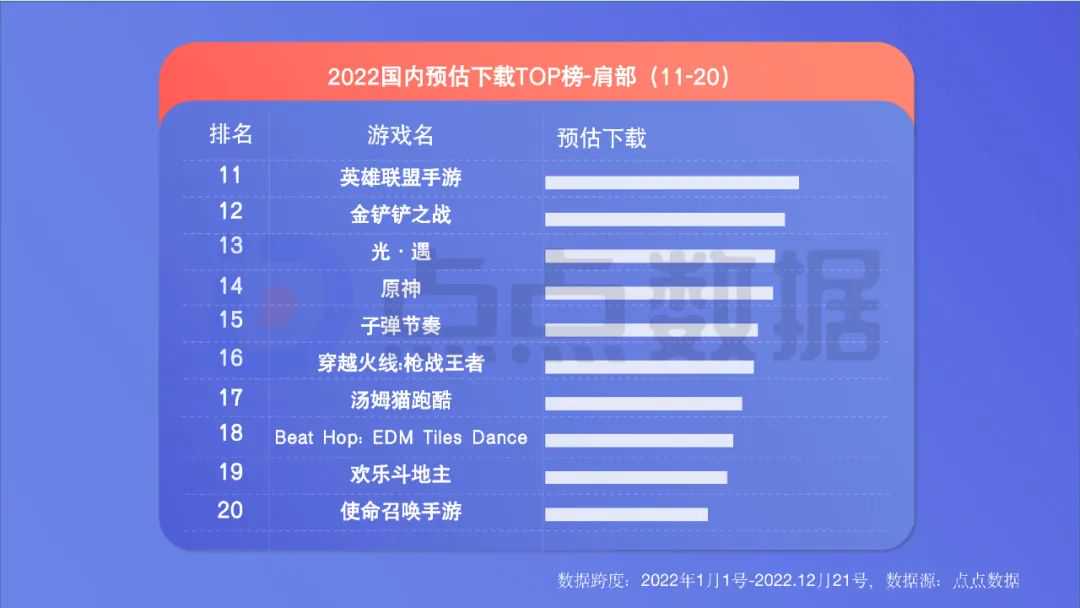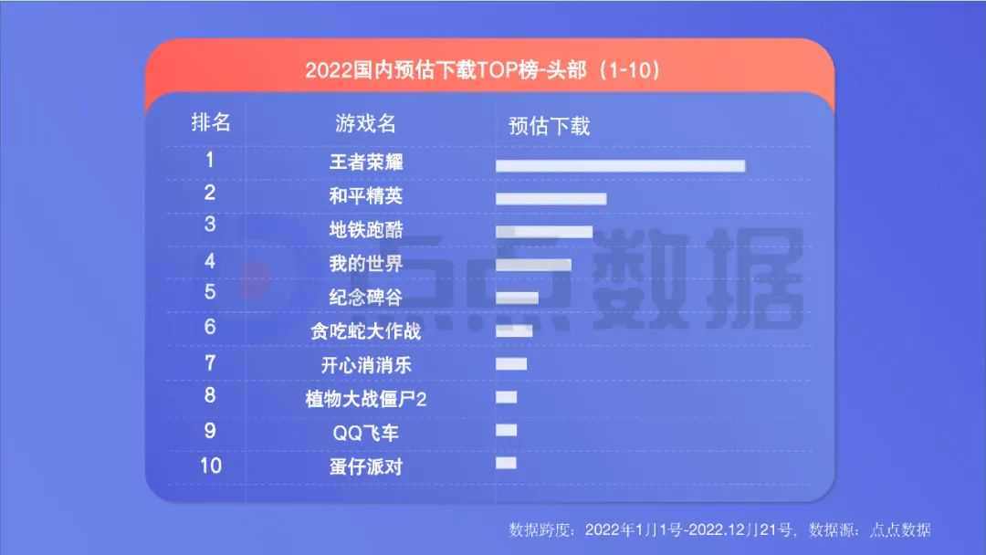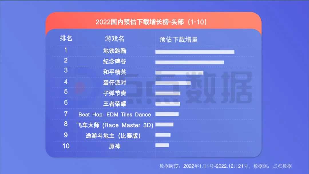 老游戏引发大量下载。下载类榜单同样有更多“老面孔”,这一方面反映出精品化趋势下,长线运营导致玩家回流;另一方面反映出新游数量少、大多吸量不佳,玩家迁移意愿低。《王者荣耀》《和平精英》的社交属性,让不少玩家“删了又下、下了又删”导致下载量名列前茅。中轻度、“怀旧型”产品亮眼。下载类榜单出现了更多中轻度产品。《地铁跑酷》位列下载量TOP3堪称2022一大现象级手游。让人哭笑不得的是,《羊了个羊》的爆火,让山寨产品《羊了咩羊:最难消除第二关!》挤进下载增长榜TOP19。同时,一些“怀旧”产品也表现出色,如《贪吃蛇大作战》《植物大战僵尸2》。