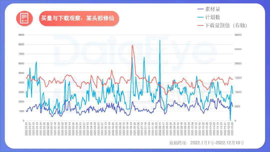 ↑案例三:严控买量节奏、素材、价格,观测“可持续买量”。该游戏是一款融合创新的修仙产品。作为买量大户,总体买量、下载量节奏却较为稳健,只有个别版更期的波动。该游戏有什么持续买量的秘密呢?