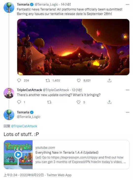 近日《泰拉瑞亚》官方在推特上发文宣布游戏1.4.4更新将于9月28日上线全平台,该作最后一次大型内容更新是一周前发布的1.4版本“旅途的终点”,此次“LaborofLoveUpdate(爱的劳动更新)”是一次补充。更新将上线新物品、新装备、秘密种子,并修复游戏相关平衡性,此外还添加了部分细节内容。