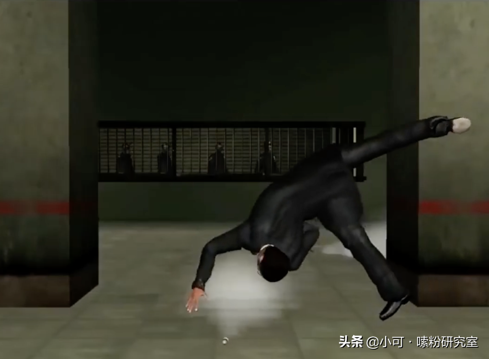 为了尽快找到Morpheus,Neo和Trinity借助电梯的反向拉伸和爆炸,来到了楼顶,并在此上演了最经典的“子弹时间”戏码,但还没有完全掌握这项技能的Neo,帅不过三秒久就倒地了,好在有Trinity补枪救援。