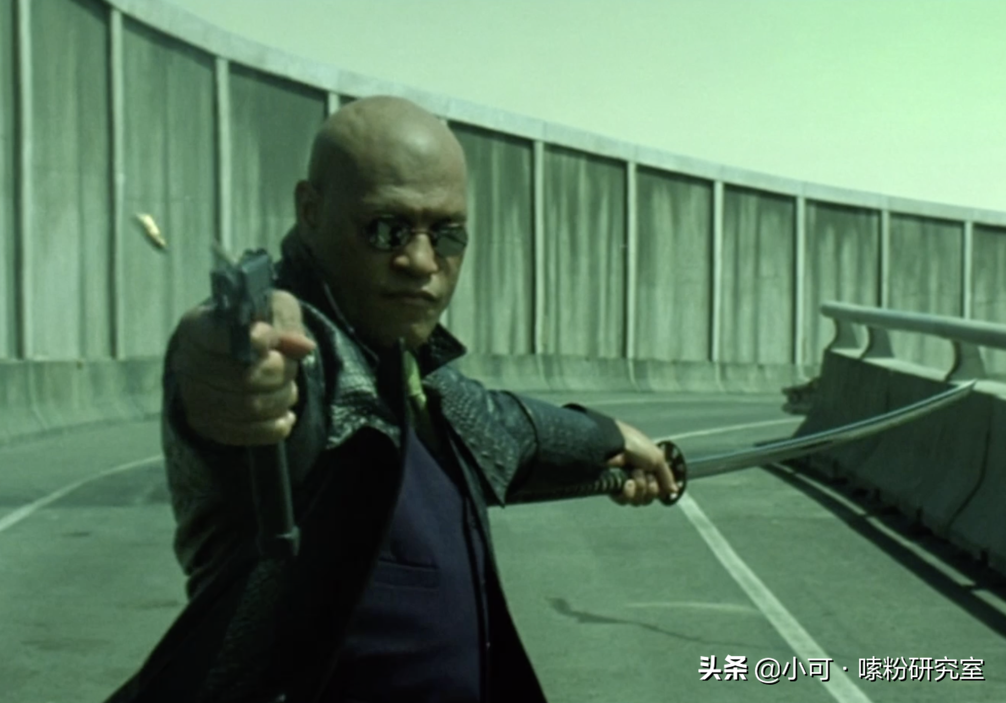 有传统武术的肉搏,当然也少不了港片动作戏常有的枪战。Neo完成单枪、双枪、轻机枪的修行后,对Neo修行成果感兴趣的Morpheus也想试一试NEo的身手。