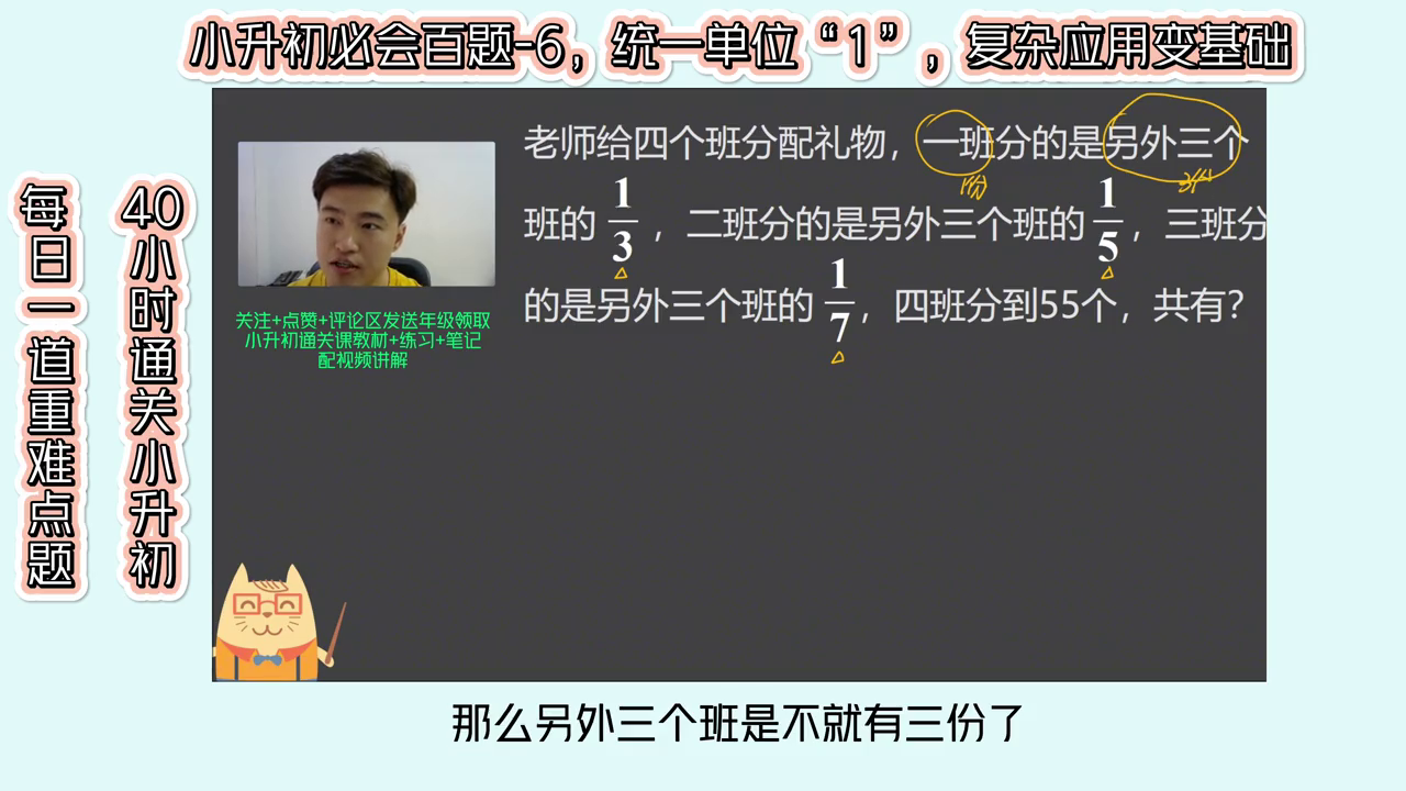 小升初必会百题分数应用题,这是一道非常容易做错的题目,一起来看。老师给四个班分配礼物,一班分的是另外三个班的三分之一,二班分的是另外三个班的五分之一,三班分的是另外三个班的七分之一,四班分到五十五个共有多少?