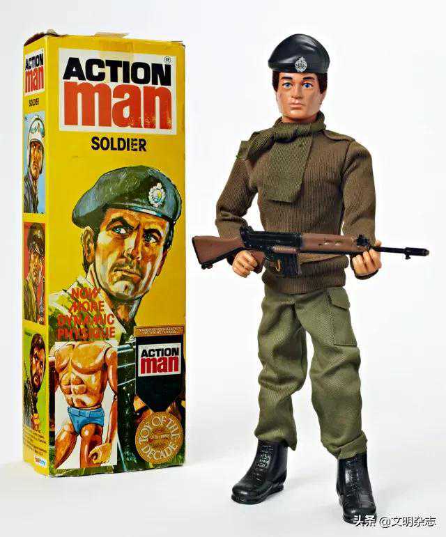 △机动人玩偶系列之士兵。1978年。玩偶中性别倾向仍然十分明显,男孩们大多以英雄和士兵作为玩伴,发明于1964年的机动人系列玩偶是其中较受欢迎的一款,玩偶起初以士兵的形象出现,随着反战声音的出现,而逐渐转变成冒险角色。