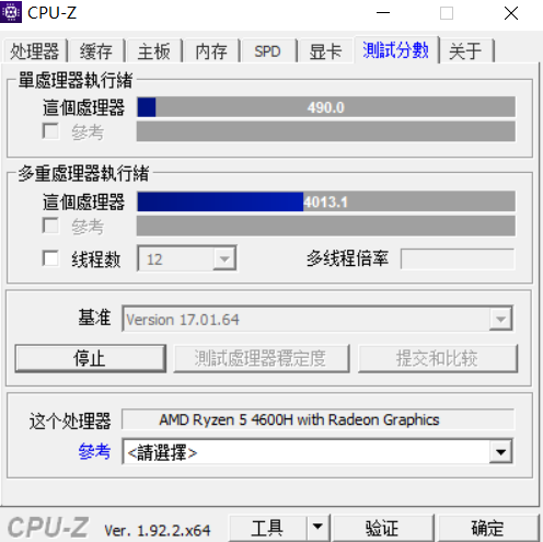 前文提到火影T5V搭载锐龙系列R54600HCPU,CPU-Z软件测试显示其采用最新7nm工艺制程,六核十二线程设计,基础主频3.0GHz,最大睿频4.0GHz,TDP45w,8MB的三级缓存。具体实际表现如何我们来跑个分进行测试。