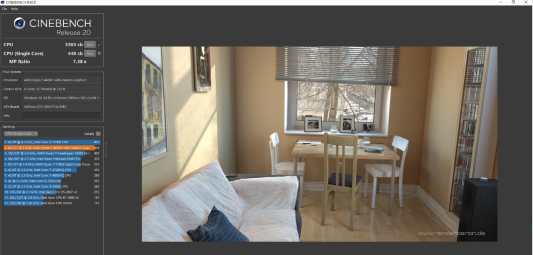 CINEBENCHR20测试中,R5-4600H单核成绩448pts,多核成绩3308pts;而i7-10750H,单核成绩459pts,多核成绩3180pts。可以看到单核成绩4600H稍逊10750H,但是多核成绩高于10750H。值得注意的是这两款CPU都是六核十二线程设计,由于前者采用7nm制程工艺,更先进的制程可以带来更低的功耗和更高的性能,后者则是14nm工艺。