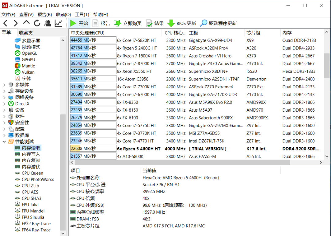 内存方面,手上这台火影T5V采用单根8G3200MHz内存,单卡槽最大支持32G,双卡槽最高可支持至64G(32G*2)3200MHz内存扩展,我们用AIDA64测试如下:
