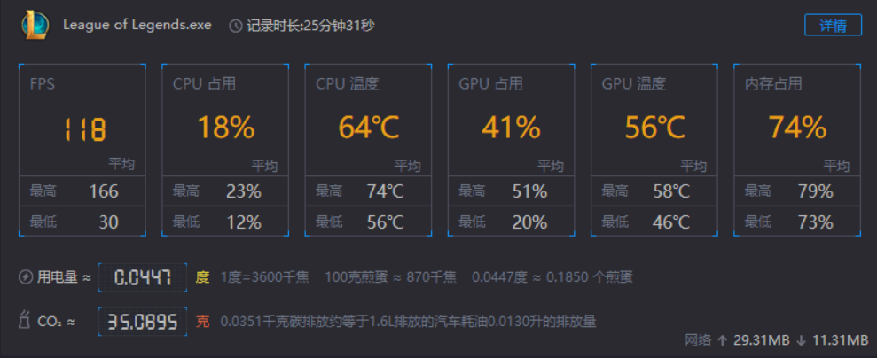 游戏模式下,我们以1080P分辨率、阴影效果、画面质量、抗锯齿等效果拉到最高运行英雄联盟游戏,测试结果显示游戏过程中帧率稳定在118FPS左右,GPU显卡占用率41%,内存占用率74%,由于LOL不需要太多性能,显卡性能发挥并不充分,火影T5V可在低温环境流畅运行游戏。