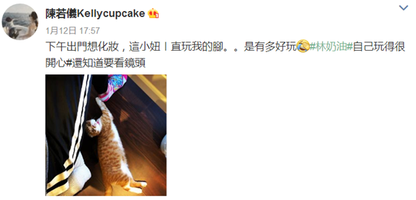 1月12日,陈若仪发微博晒出一张kimi哥哥爱猫的照片,“下午出门想化妆,这小妞一直玩我的脚,是有多好玩,林奶油自己玩得很开心,还知道要看镜头……”