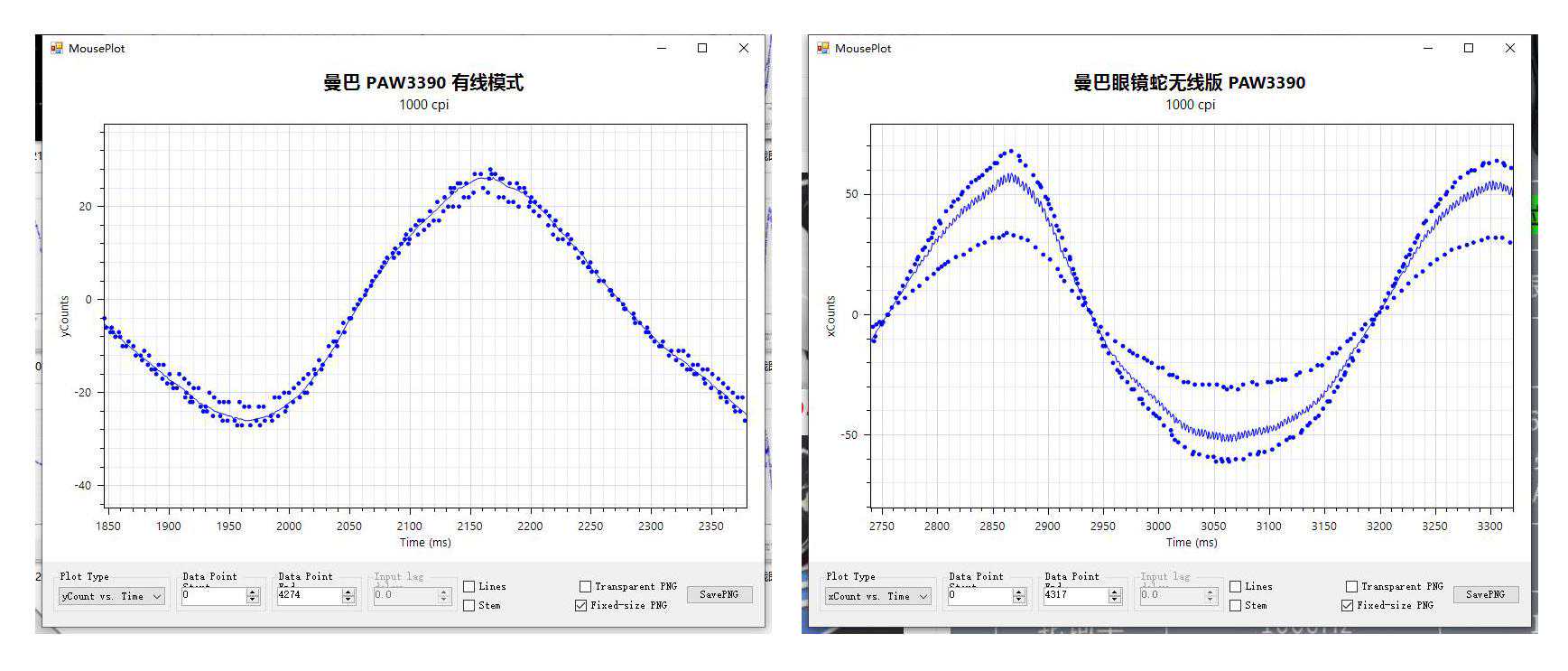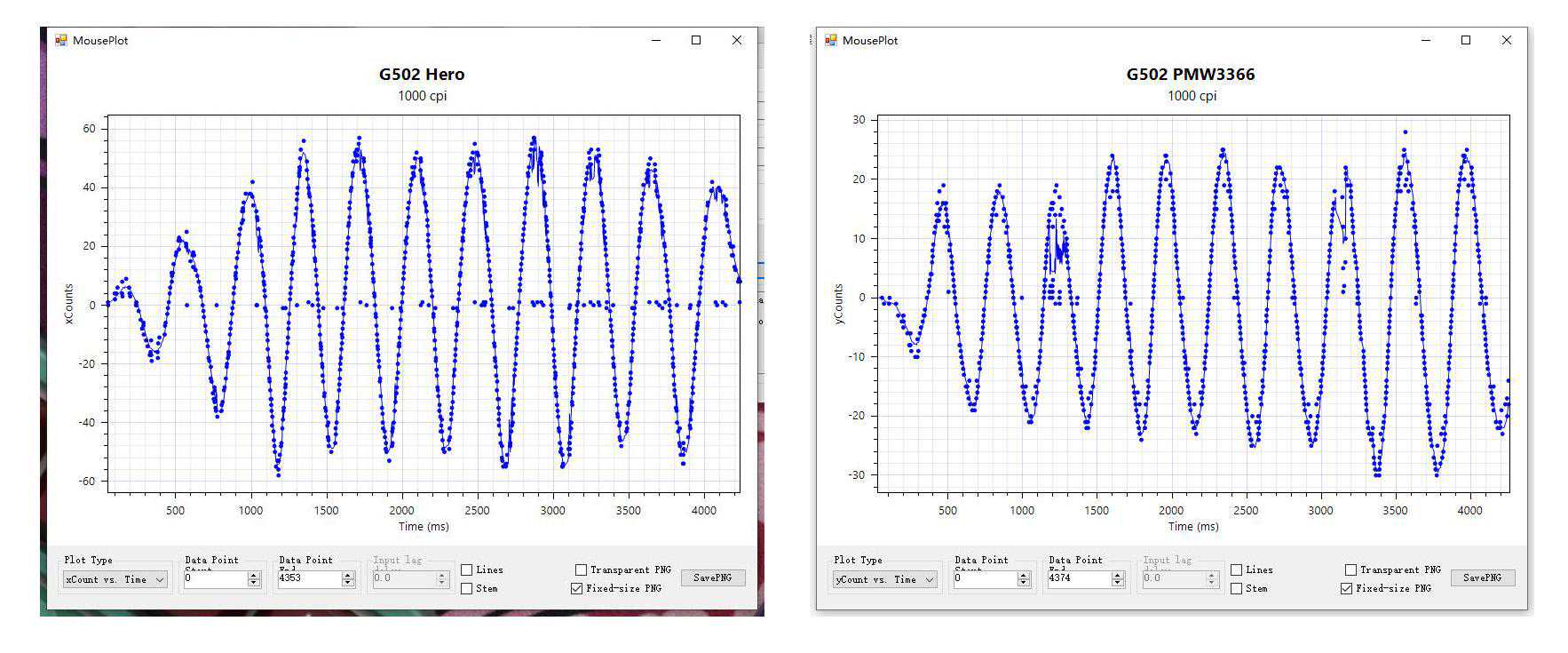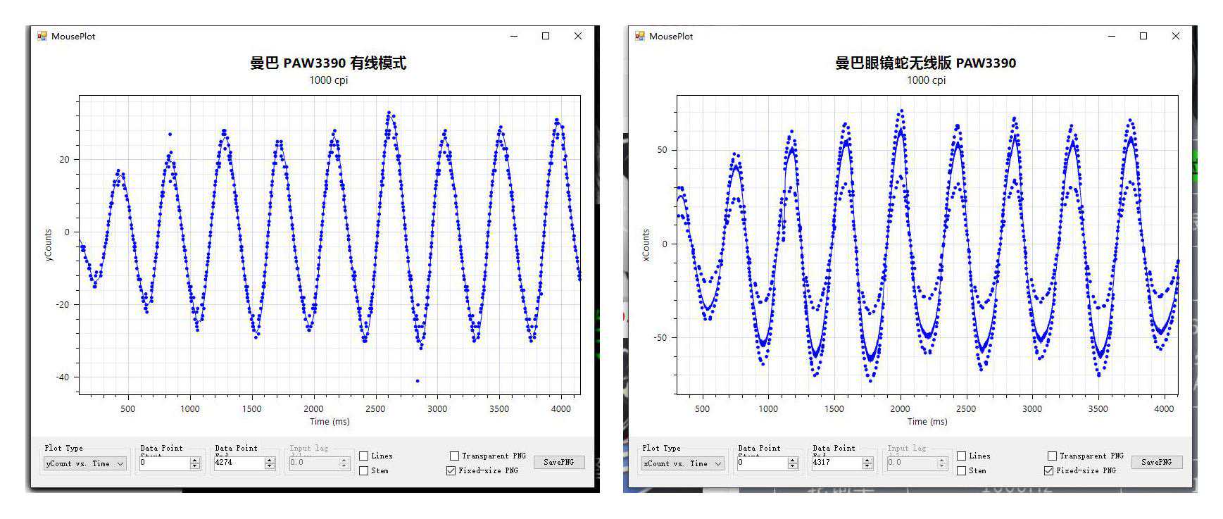 对比两款芯片的实际测试,1000cpi下可以看到PMW3366的抖动要更加厉害,甚至还出现了轻微的丢帧,HERO的离散更加稳定。两者稳定性上存在差距,但十分微小,肉眼几乎无法感知。