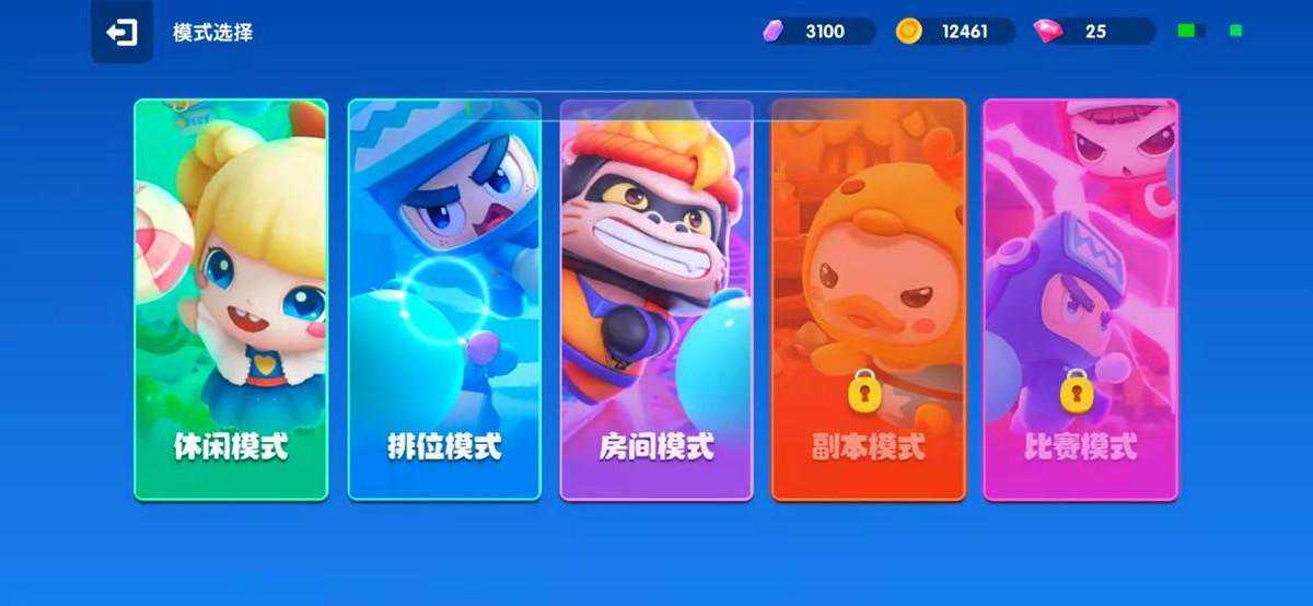 游戏中目前一共安排了7种模式,休闲模式—经典的决胜生死局、抢糖果大战、搬运能源、超人快跑,排位模式—大乱斗、百人演习、复活赛。目前玩家还可以在模式中看到“副本模式”、“比赛模式”,但目前还未上线。