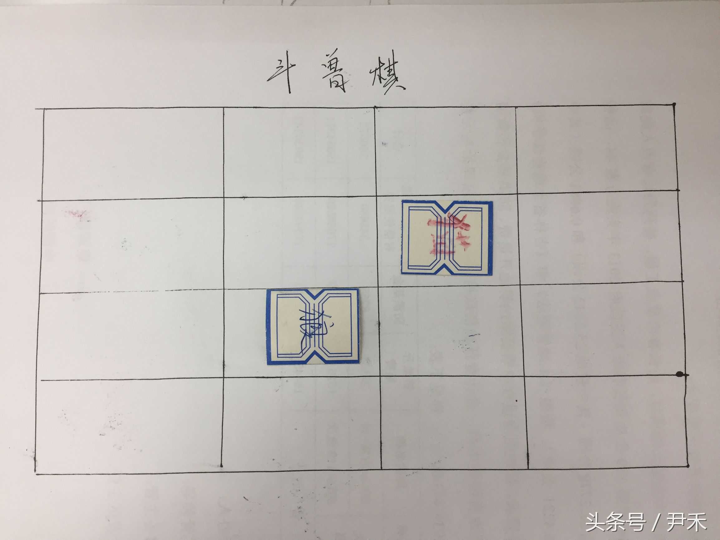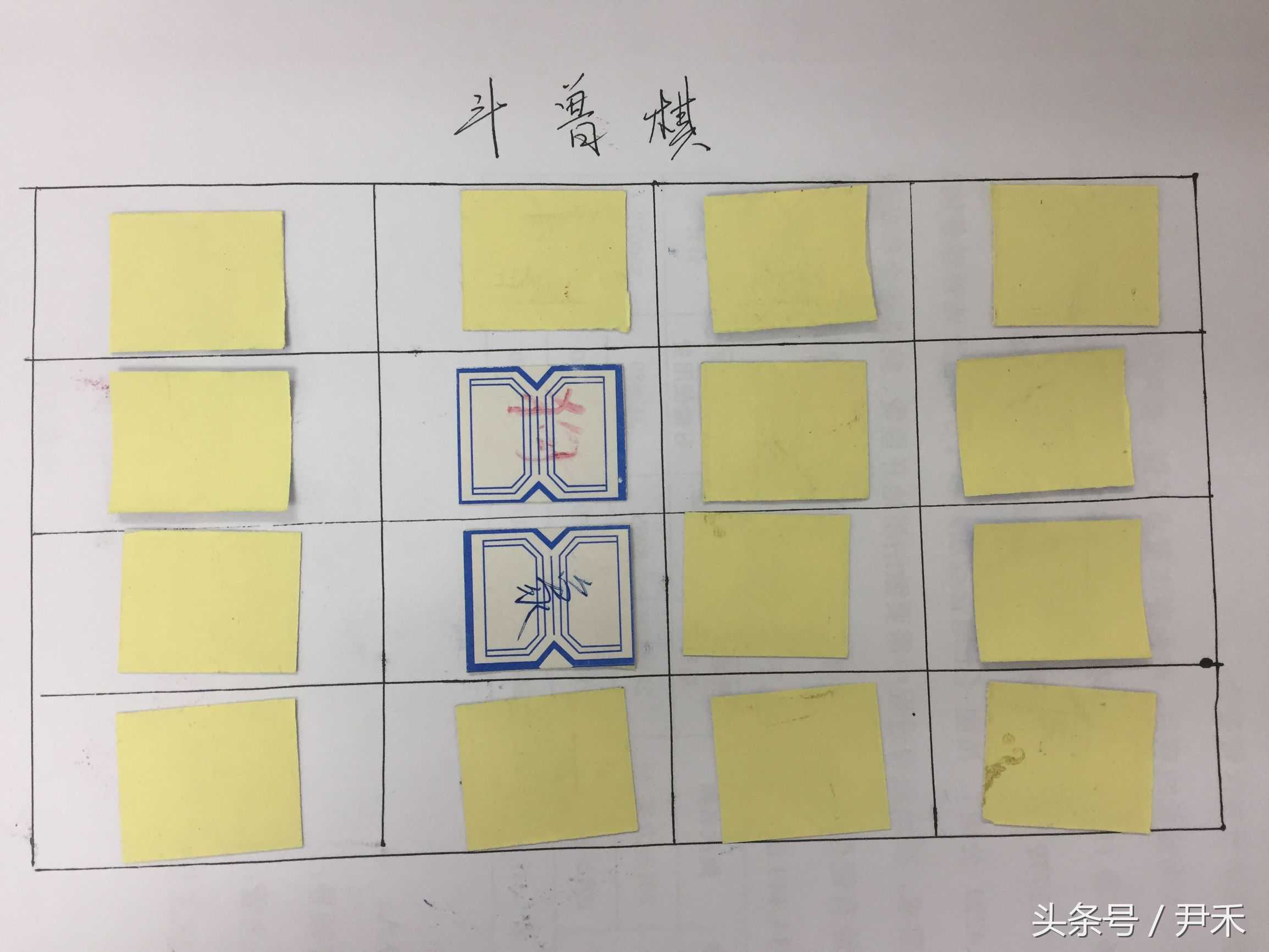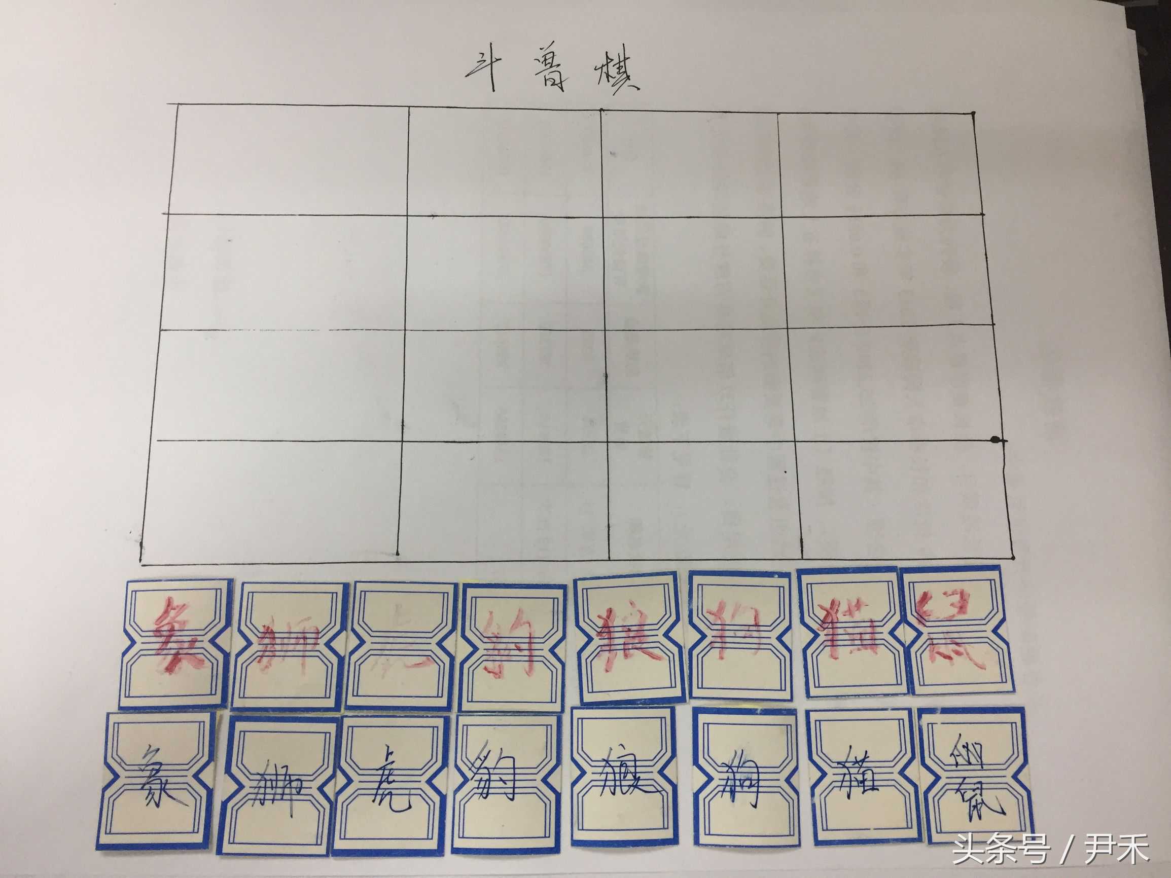 玩法很简单,学校门口的小卖铺就会有一毛钱一张的斗兽棋,用剪刀裁剪一下,如果没有零花钱,就用纸片代替一下。棋盘就更简单啦,画个4*4的格子就行。