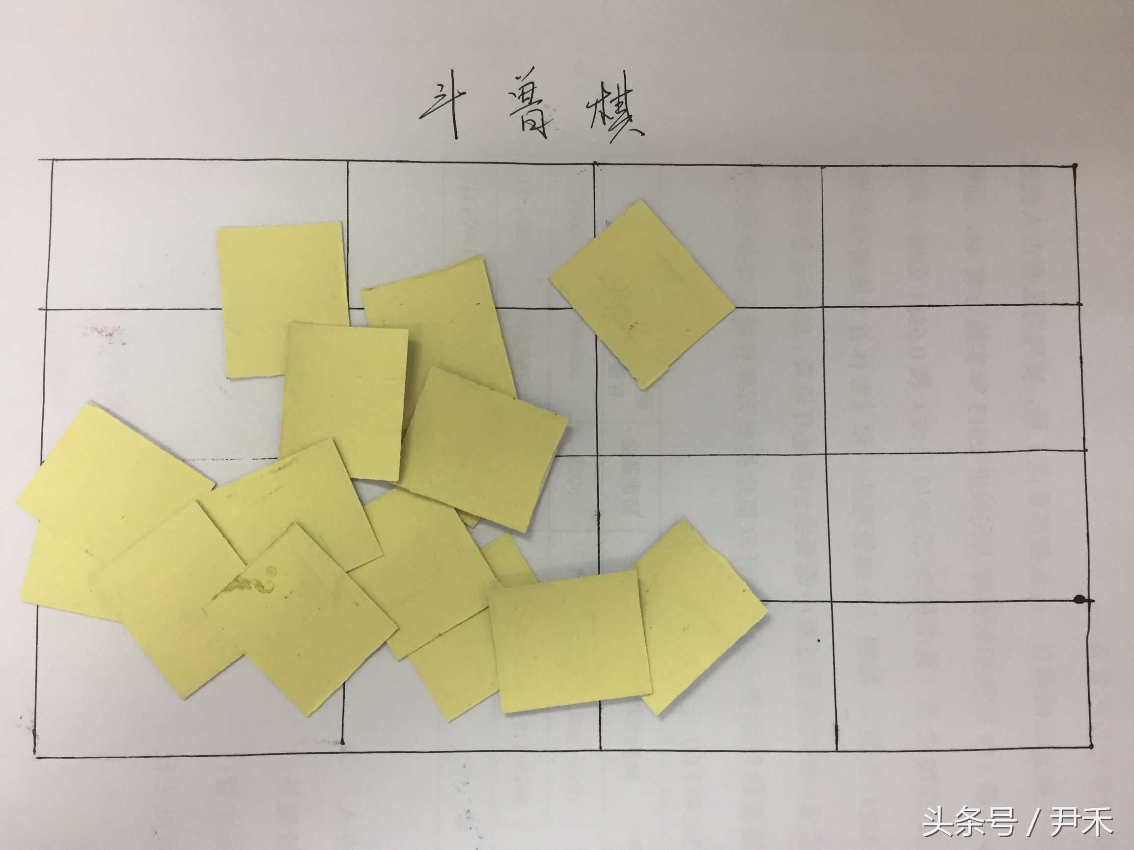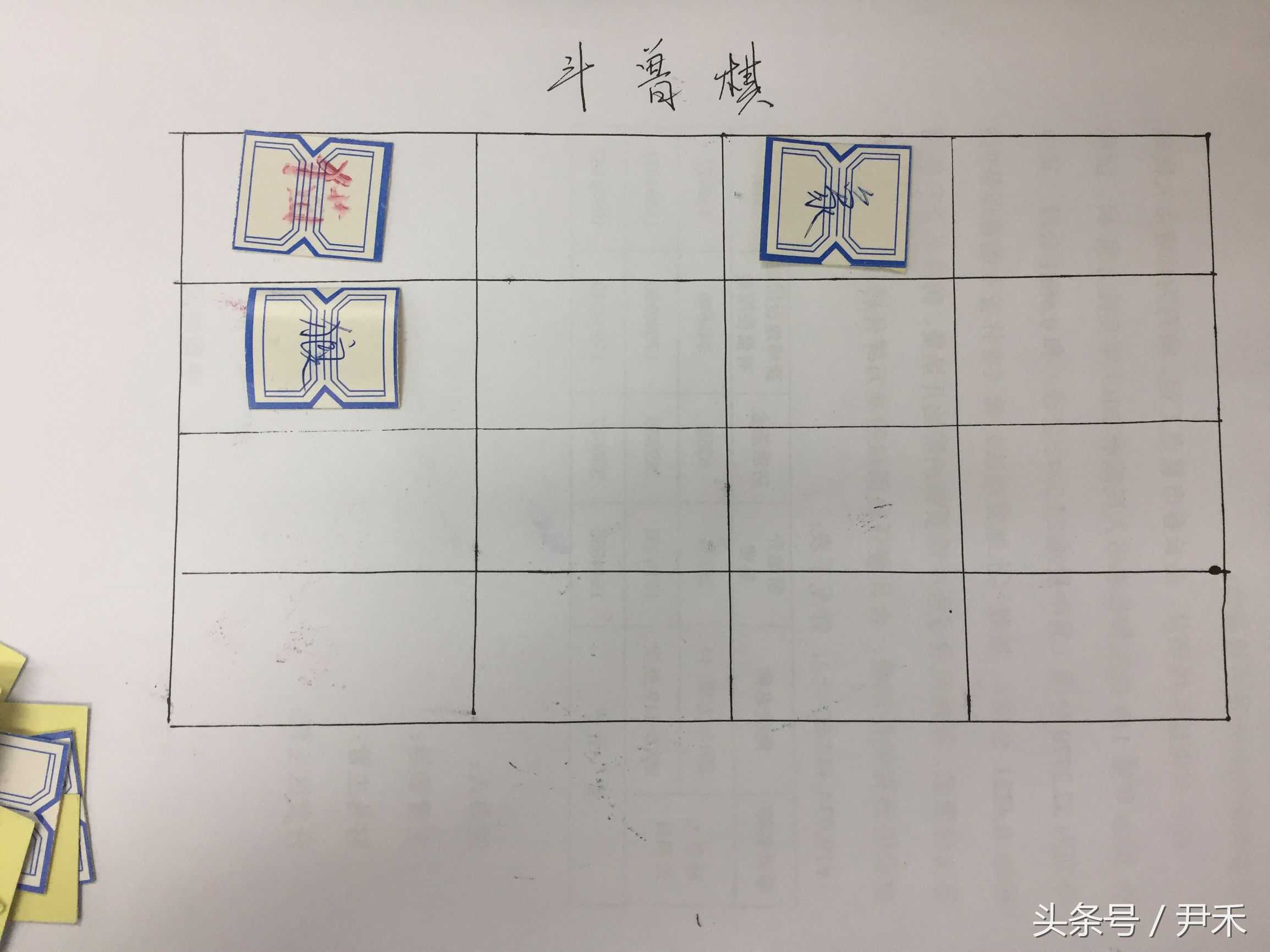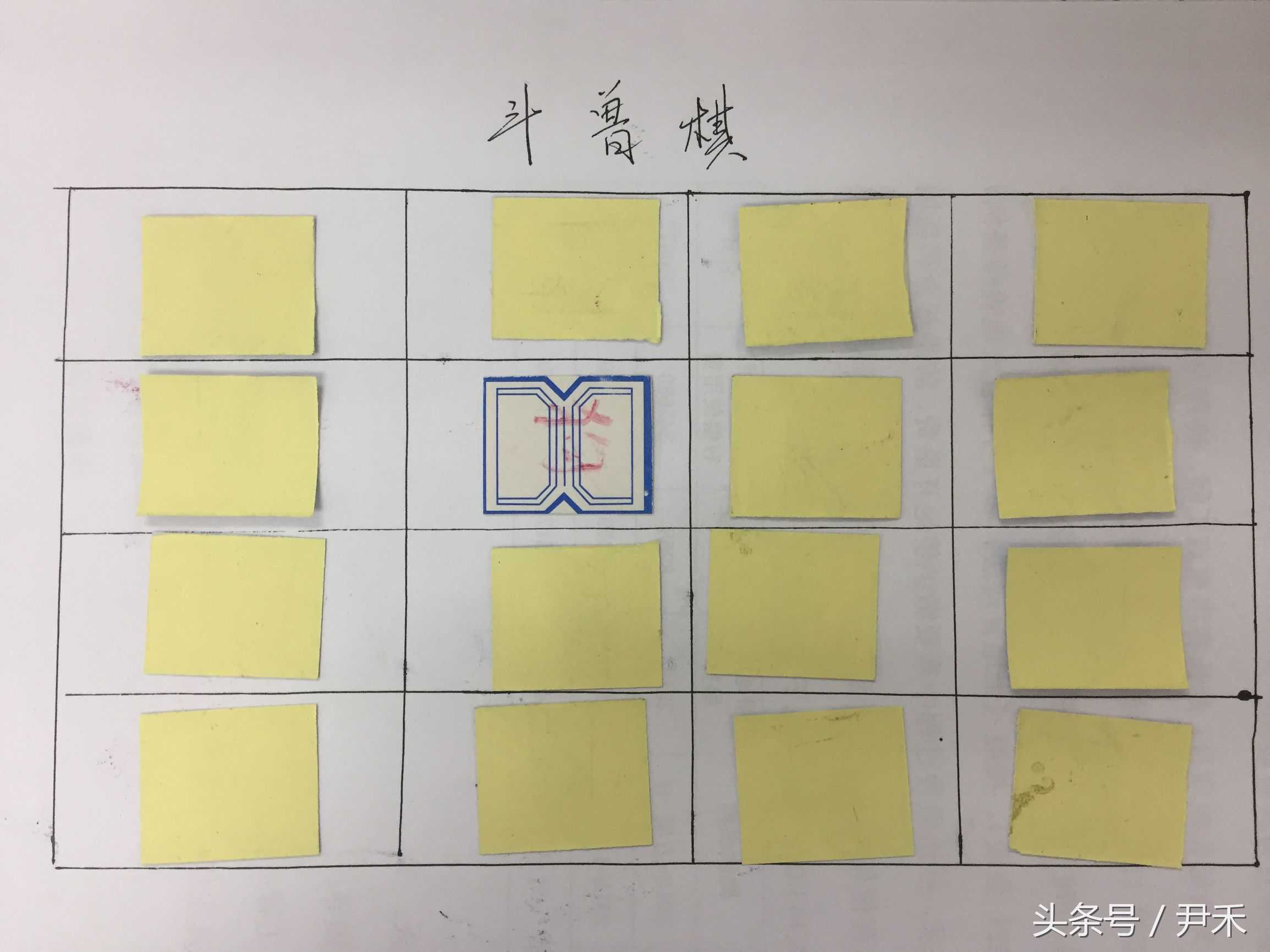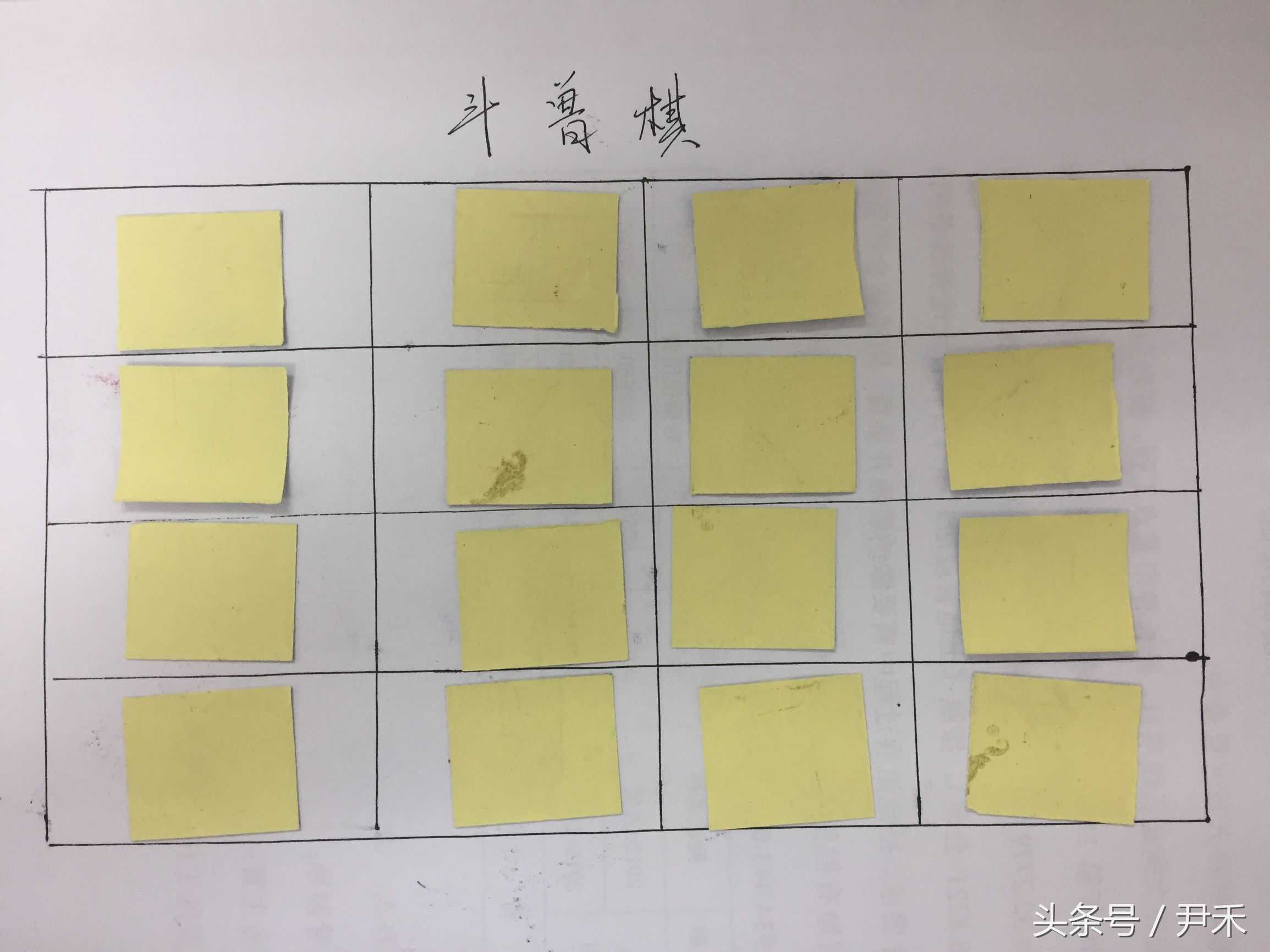 玩法很简单,学校门口的小卖铺就会有一毛钱一张的斗兽棋,用剪刀裁剪一下,如果没有零花钱,就用纸片代替一下。棋盘就更简单啦,画个4*4的格子就行。