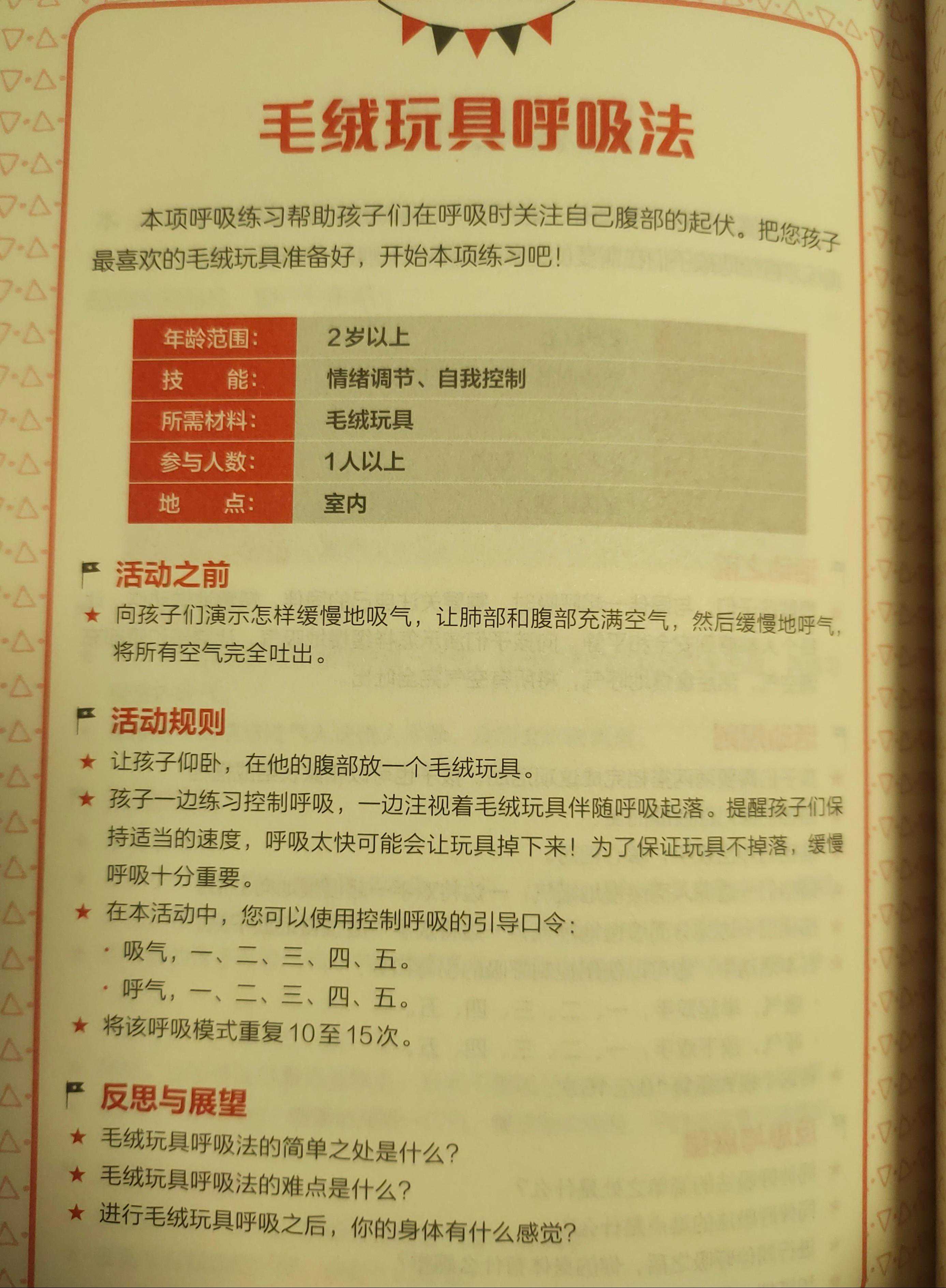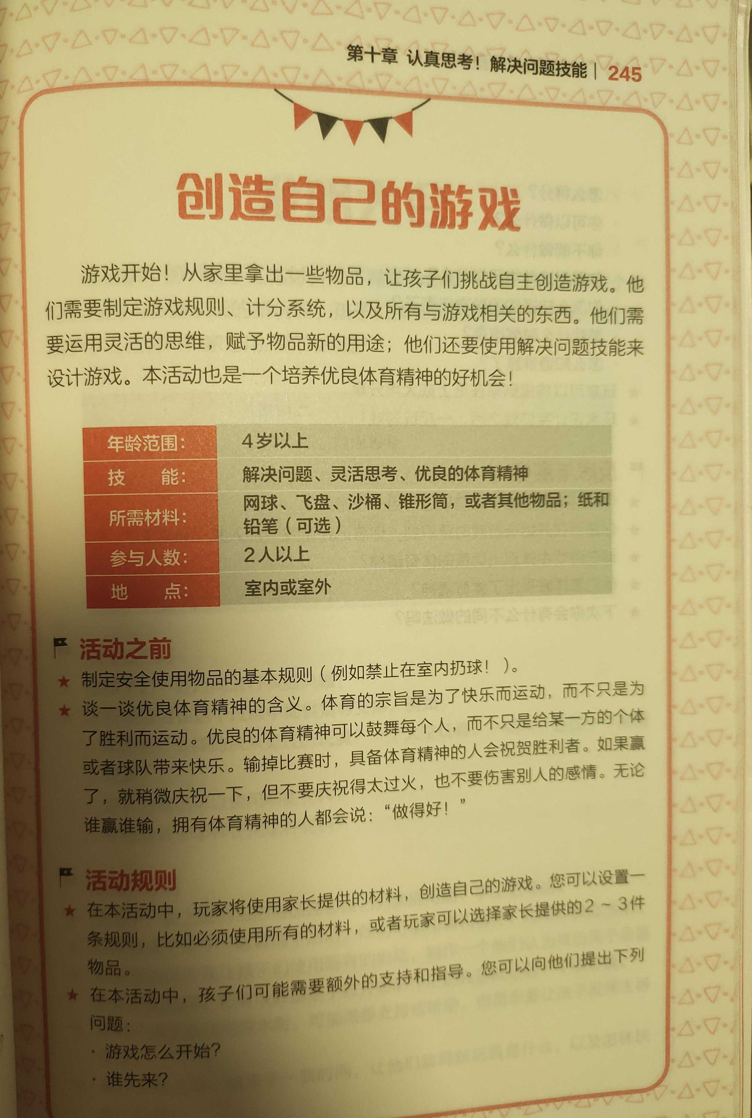 除以上四方面,在责任、共情、参与、情绪调节、解决问题、尊重六方面提出了很多互动小游戏,每一个小游戏都标注了年龄范围、培养技能方向、所需材料、人数、适合地点、活动准备、活动规则、游戏反思和展望。