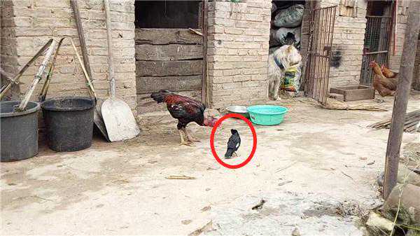 据介绍,事发前,主人在院坝的空地上给小鸟喂食,一只公鸡见状便走过来抢吃,并将小鸟挤到了旁侧,因其身材高大,小鸟不敢反抗,只是不停的叫,像是发出警告。