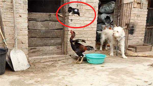 谁知公鸡得寸进尺,最终完全霸占了“吃食区”,小鸟忍无可忍,乘其不备,飞身而起,啄公鸡的头部,然后借助自己的飞行优势,居高临下发起攻击,啄得公鸡到处奔走,狼狈不堪,几秒种后,小鸟着地,公鸡趁势攻击,将小鸟叼住,然后跑入屋内,但小鸟很快挣脱,继续发起公鸡。就在这时,另有一只公鸡前来助战,小鸟见状疯狂挥舞脚爪,并快速动尖嘴啄打对手,几秒钟后,前来助战的大公鸡便逃之夭夭了,战事由此平息。