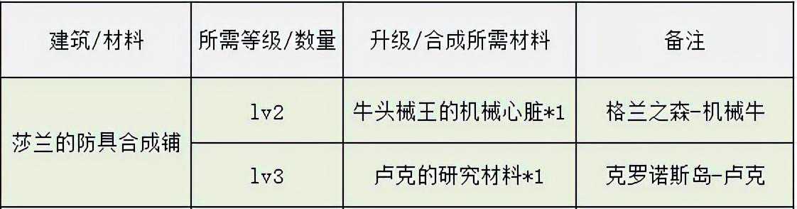 ①“林纳斯的武器商店、莎兰的防具商店、希尔斯的防具商店”lv2升lv3,各需要一个。