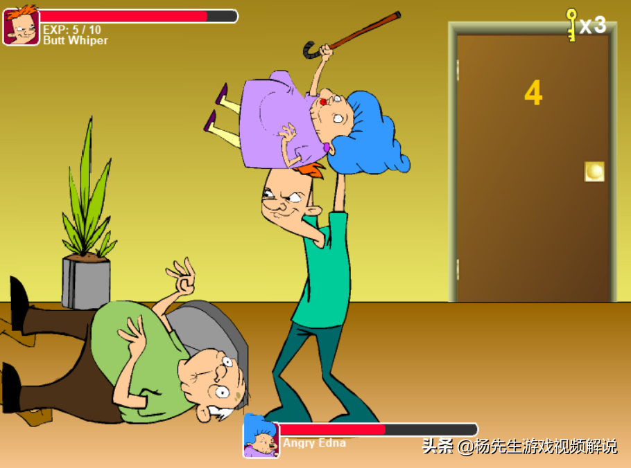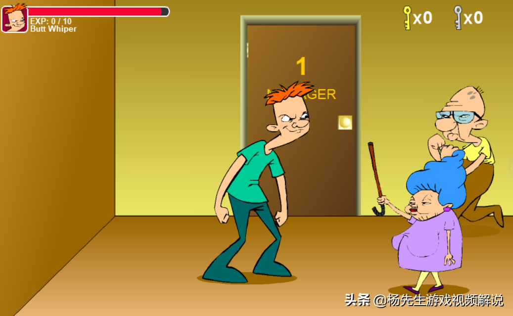 游戏背景主要是敬老院里面的老人因某些原因发生了集体暴动,然后就通过各种手段来反抗上图这位老板的统治,比如随地拉屎啊,到处吐痰啊什么的【不要问我怎么知道的】,好吧,因为开头有一小段动画。因此,上图那位开敬老院的老板就找到了游戏中这位拽拽的主角,两人一见如故,随即开始夫唱妇随,啊,不对,狼狈为奸!准备收拾一下这些老人。然后我们这些玩家就只能助纣为虐,把拳头挥向这些老人。