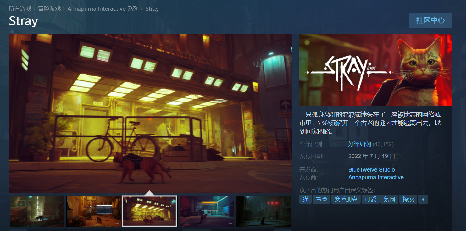 法国独立工作室BlueTwelveStudio制作,安纳布尔纳本月中旬发行的《迷失》(Stray),已经成为了2022年迄今为止Steam玩家评价最高的游戏。