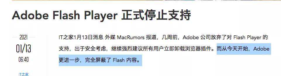 2020年12月31日,Adobe停止了对FlashPlayer的支持;