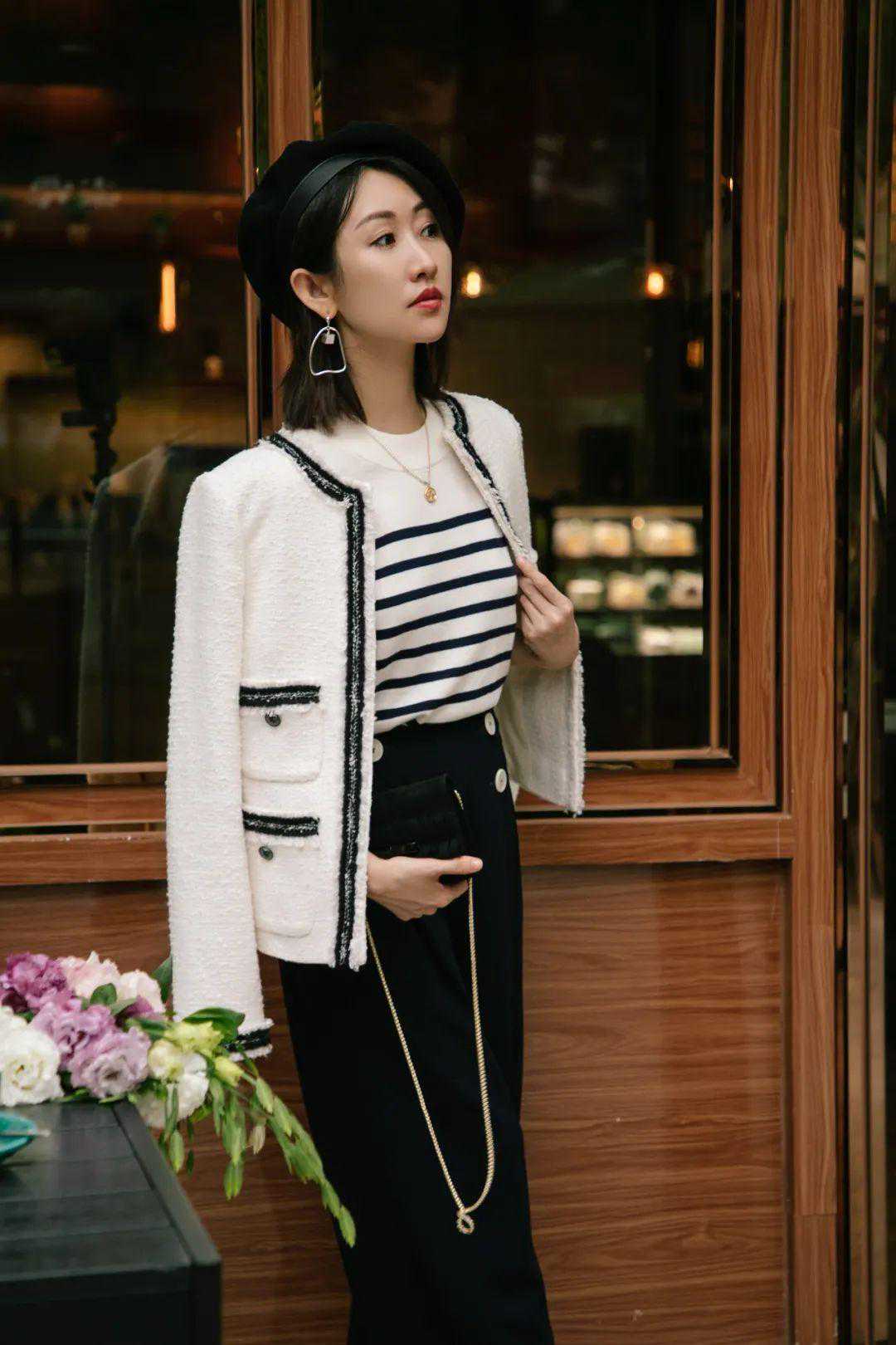 条纹衫配阔腿裤,再加上粗花呢外套,这是常见的法式风穿搭套路啦。别忘了再加一顶贝雷帽。