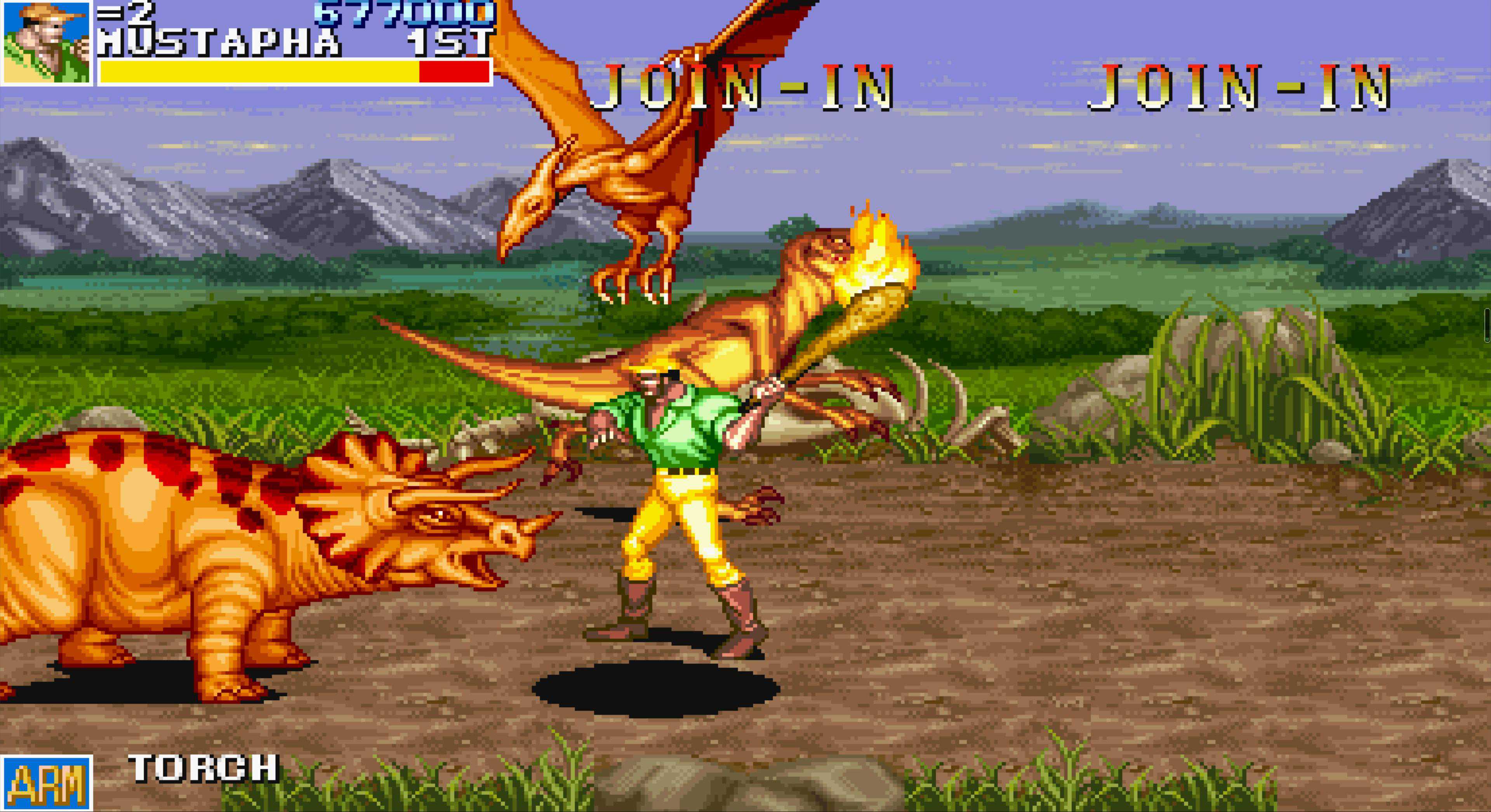 这是“恐龙快打”中最难的一关,在所有老卡的横版街机游戏中,这个BOSS的难度也是排得上号的,小时候玩基本两三条命就扔在这里了。即使现在,我除了用黄帽能有六七成把握一命过关,其他角色依然非常困难。至于安全打法……嘿嘿,没有,反正我是研究不出来。用黄帽不用多说,他的飞踢距离远、速度快,很容易同时控制住两人,且能跳过BOSS的冲斩,相对要简单许多。若是用其他角色,我只能说几个要点: