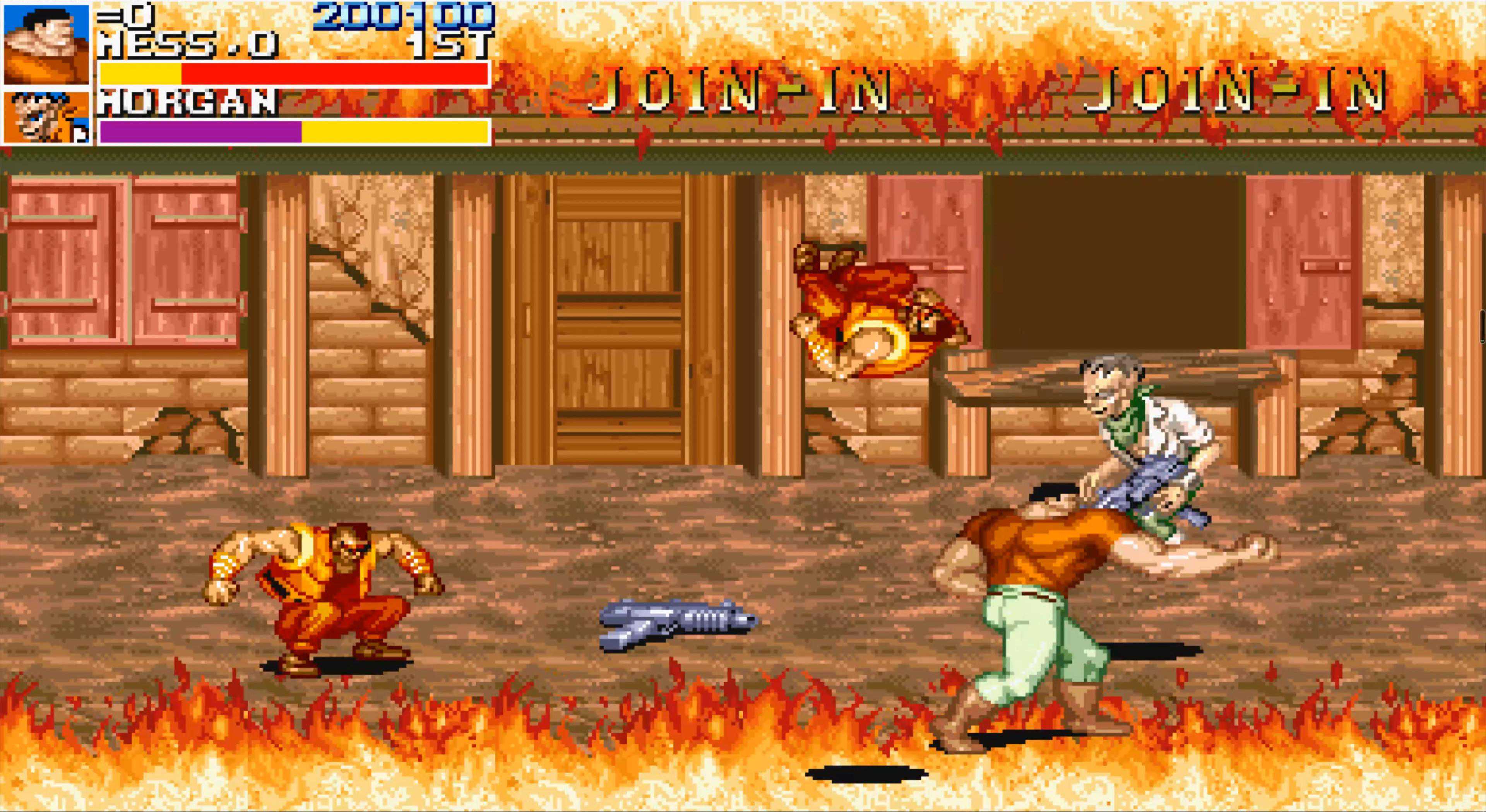 BOSS第二形态,小时候玩觉得真难,因为那时我们只会用“前前A”发动攻击,而这招打不倒BOSS,然后就被又抓又咬。后来知道了这个BOSS要受到两次倒地判定才会真正倒地,于是研究出了先跳踢一脚再连一套组合拳的打法,只要与BOSS错开身位,这个打法还是非常安全的。其实直接打组合拳摔投也是可以直接令它直接倒地的,它的“霸体”并不免疫投技。