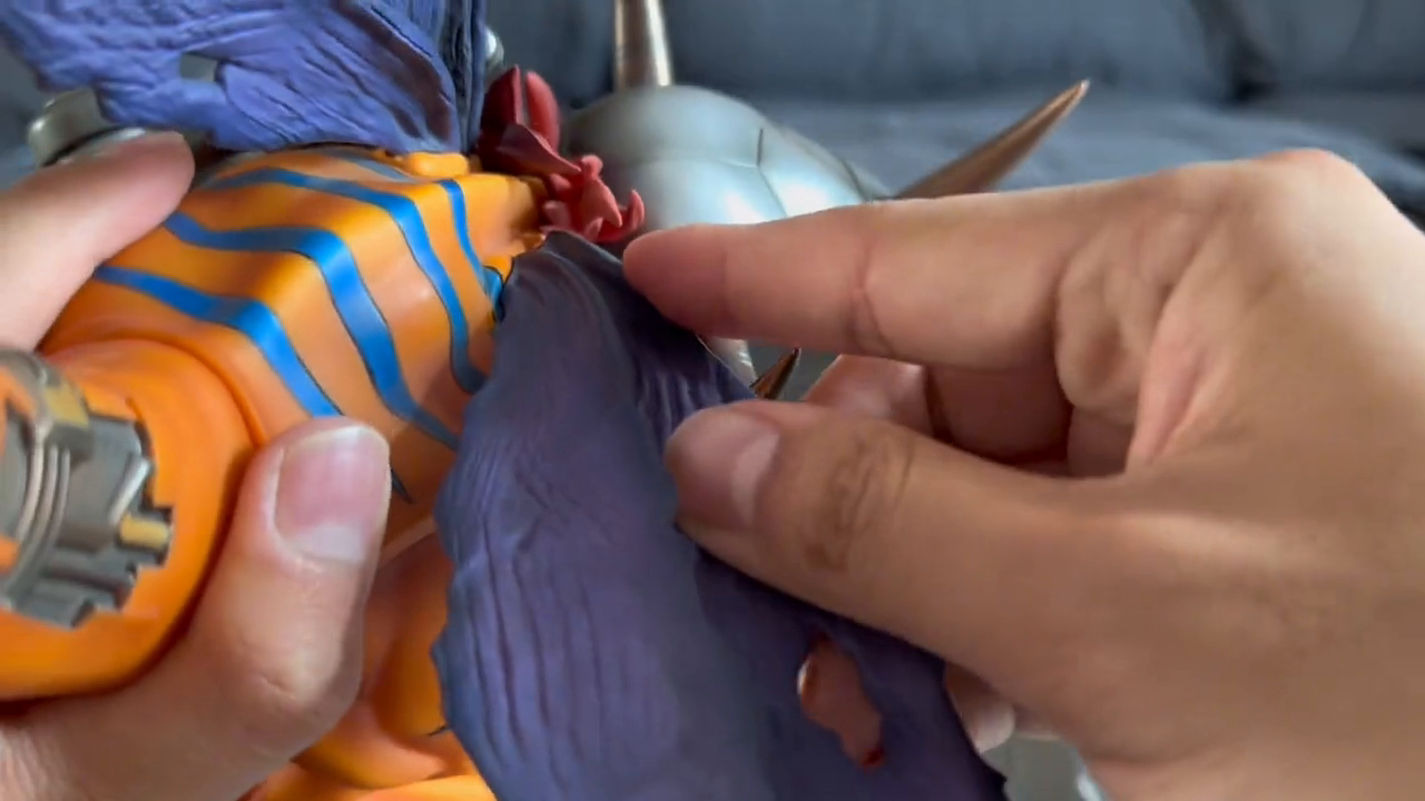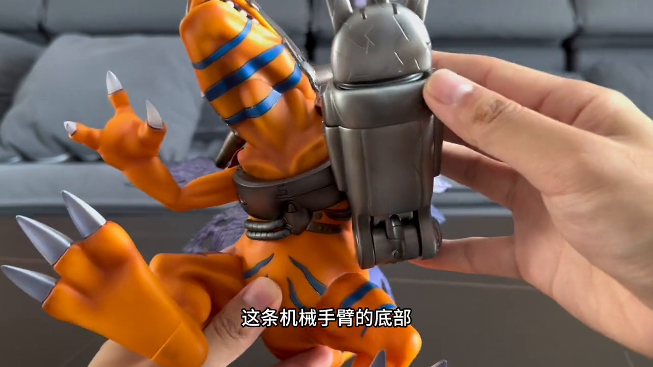 这款机械暴龙兽除了第一印象非常惊艳,拿在手里也很轻,看起来很重,但实际上它是空心的,脚掌很大,非常稳定。后脚掌和尾巴连接处都有一条线。整个手办的涂装和细节处理都非常出色,质感也非常好。机械臂底部的细节刻画也很到位,让人感到非常舒适。尾巴和翅膀的处理也很出色,没有任何瑕疵。
