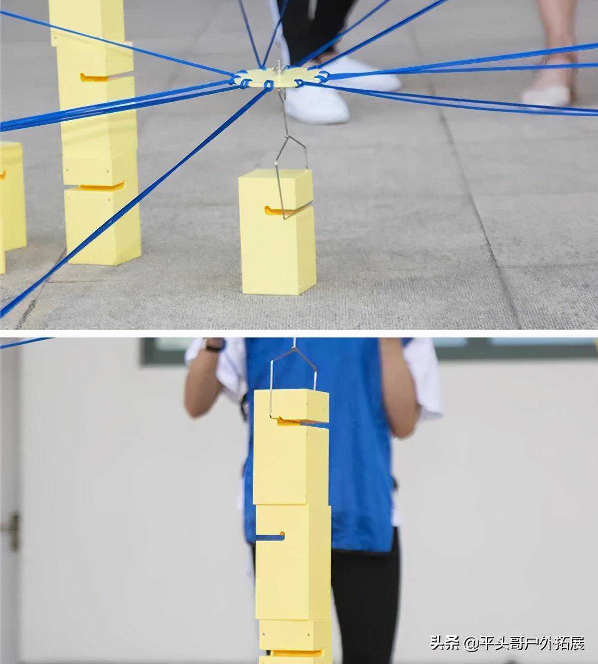 一个团队可以做成的事有很多,那何尝不来试一下这个合力筑塔呢?大家一起拉紧绳头来控制塔钩移动,用塔钩将一块块塔吊起,按照教练分发的任务书搭好模型。简单来说就是根据人数在塔钩处系上足够数量的绳索,在所有人的控制下一起吊起相应的基础版块,并摞起来就能获胜啦。