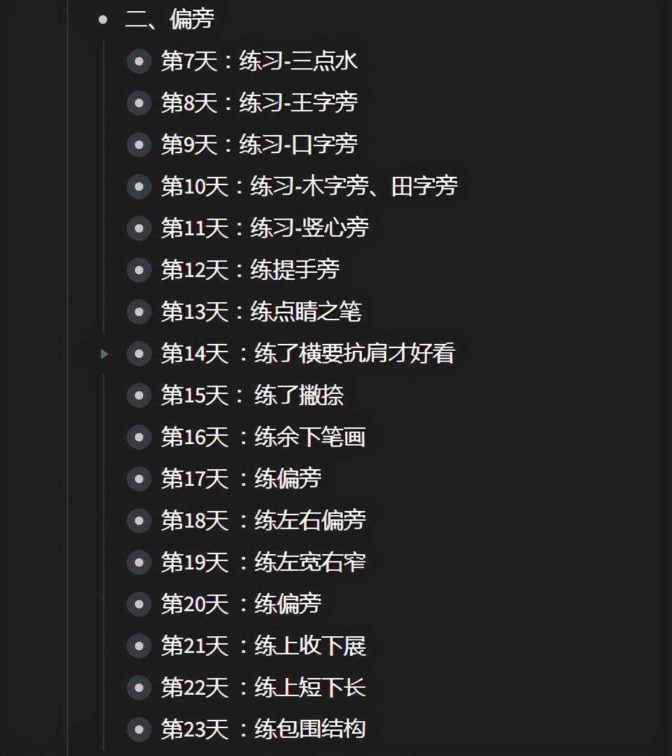 2、接下来的第7-23天,练了田英章行书字体上的所有偏旁,一共用17天的时间,这个过程中还可以,只是开头的时候遇到了一点挑战,毕竟偏旁比笔画更难了一些。