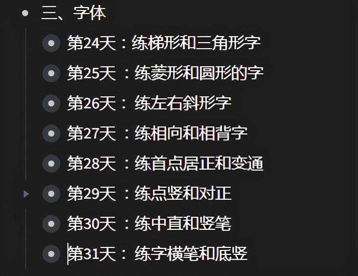 1、前6天以练笔画为主,练了9个主要的常用笔画,练每个笔画的时候简单练了两个相近笔画。