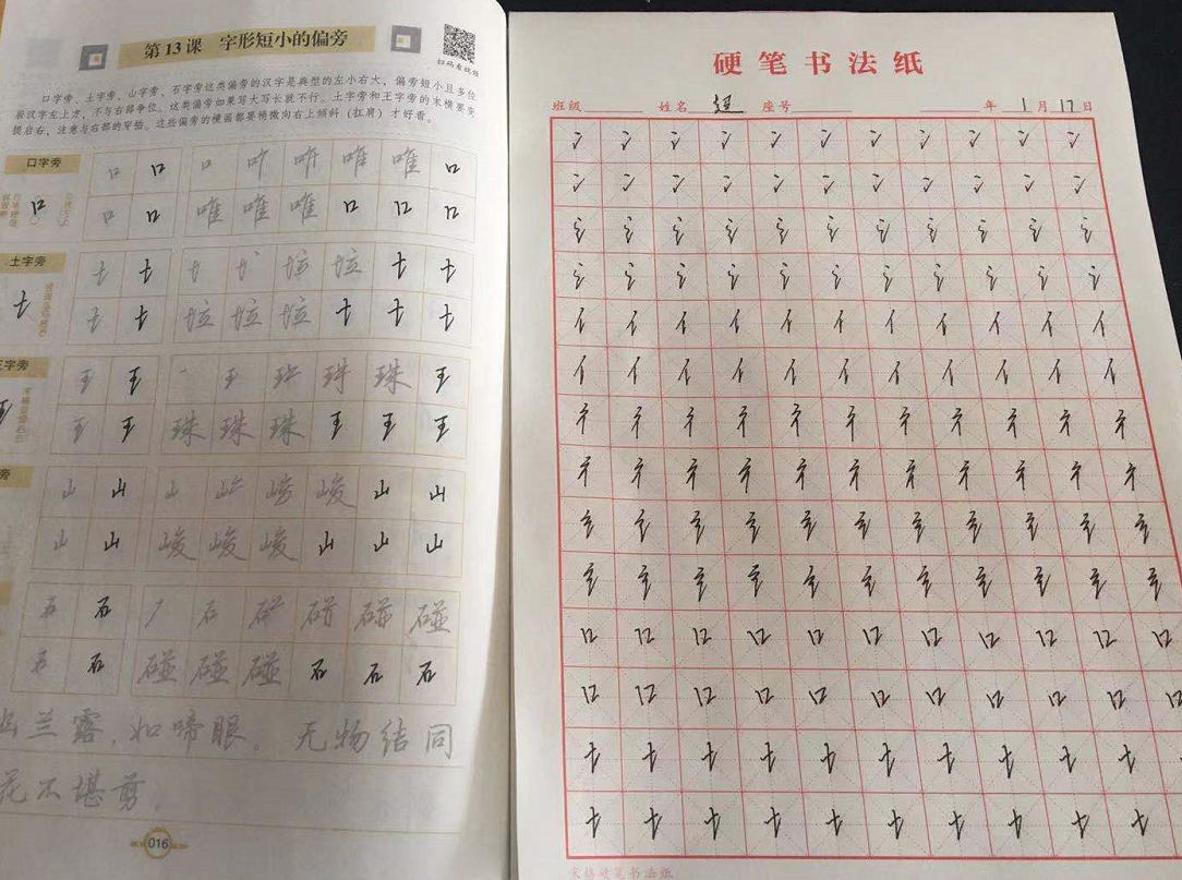 掌握偏旁基本书写很重要,知道怎么写,先写出来,再一个一个跟字帖对照着着写。调整:练不追求数量,先保证质量。