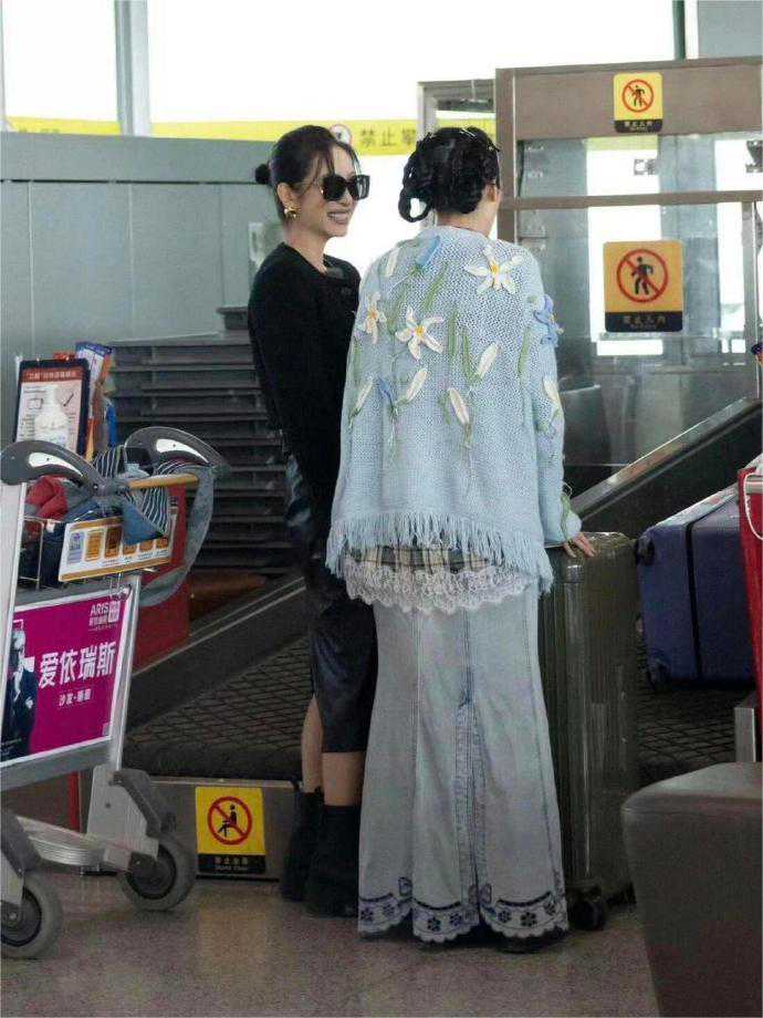 赵昭仪选择了一套牛仔喇叭半裙搭配,马尾辫,格子衬衣搭配针织毛衣外搭,突显她时尚前卫的风格。