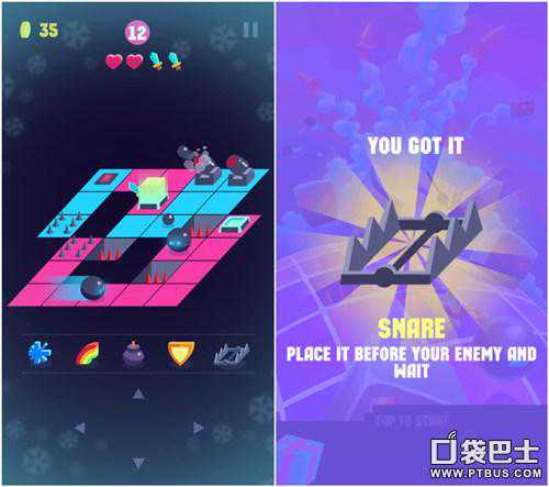 随着关卡的深入,每关出现的危险也会越来越多,游走的危险生物、各种陷阱机关时刻威胁着Pip的生命安全,当然面对这一切我们也不是束手无策的,强力道具们的出现将会助我们一臂之力,比如改变格子的彩虹、干掉危险生物的捕猎夹子等等,都是称手的宝贝。除了场景中捡拾的道具以外,我们还可以通过商店来进行购买,但这些售价都普遍较高。