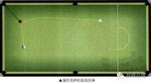 如果击打的是有角度的球,则使用强烈低杆时,白球撞击目标球后,首先由于惯性的作用会沿力学分离角运行一段距离,发力越大,惯性作用下行进的距离越长,随后在自身回旋的作用下迅速往回运行。综合效果体现为白球的运行线路为一条弧线,但这条弧线的弧度并不是均匀的,前半程弧度较大,随后弧度逐渐消失,当台呢的摩擦力将白球的回旋力完全抵消时,白球就将沿直线滚动前进。如果低杆不强烈,弧线的效果则不明显。